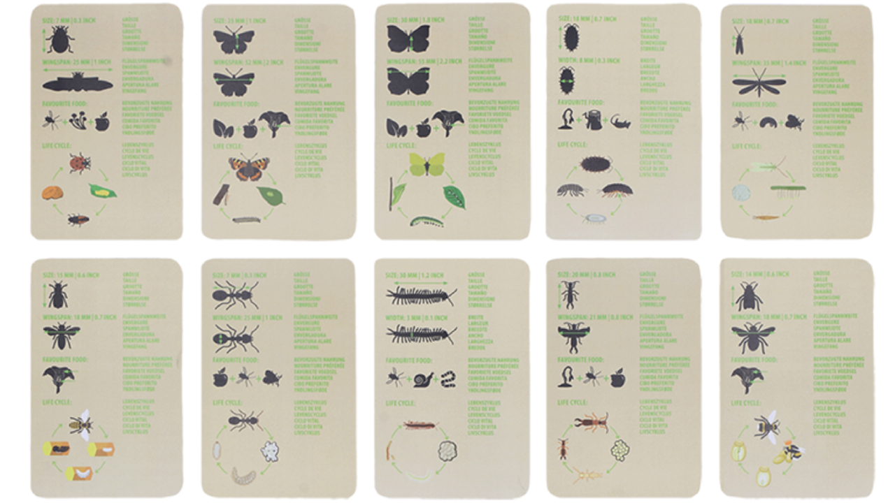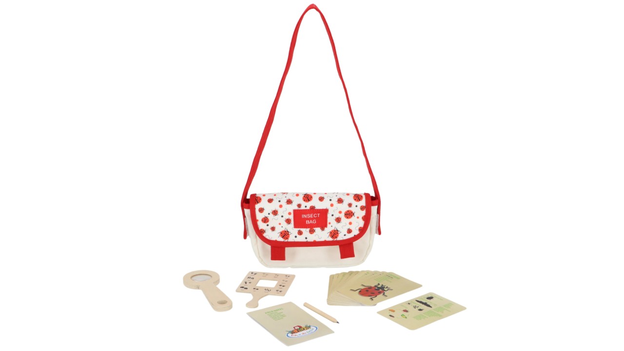 Setul include o geantă practică, o lupă din lemn, fișe informative despre diferite specii de insecte în mai multe limbi și un carnetel și un pix.