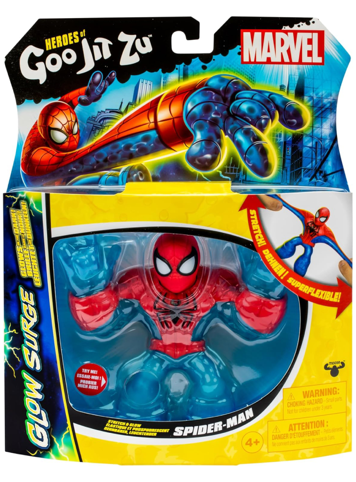 Eroii din Goo Jit Zu Glow Surge aduc o întorsătură interesantă Spider-Man-ului Marvel cu o umplutură unică care strălucește în întuneric, transformând jocul nocturn într-o aventură iluminatoare.