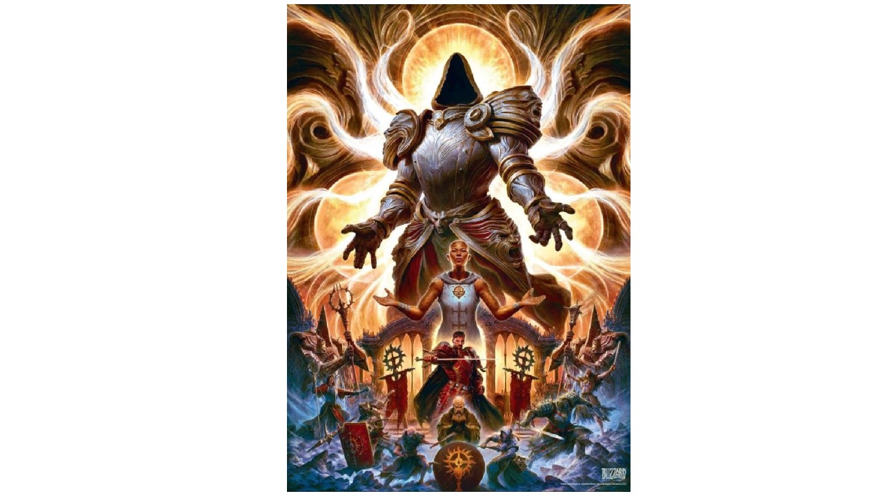 The fine details of the angelic armor and the mysterious aura are accentuated by a gloomy and dramatic landscape in the iconic style of the Diablo universe.