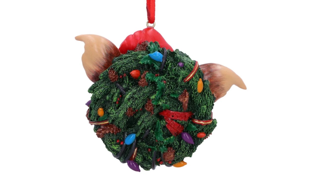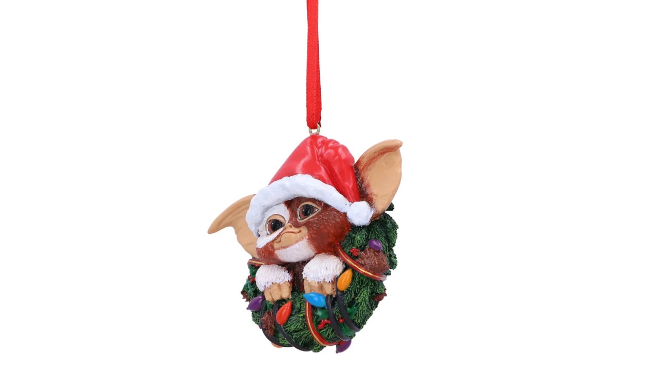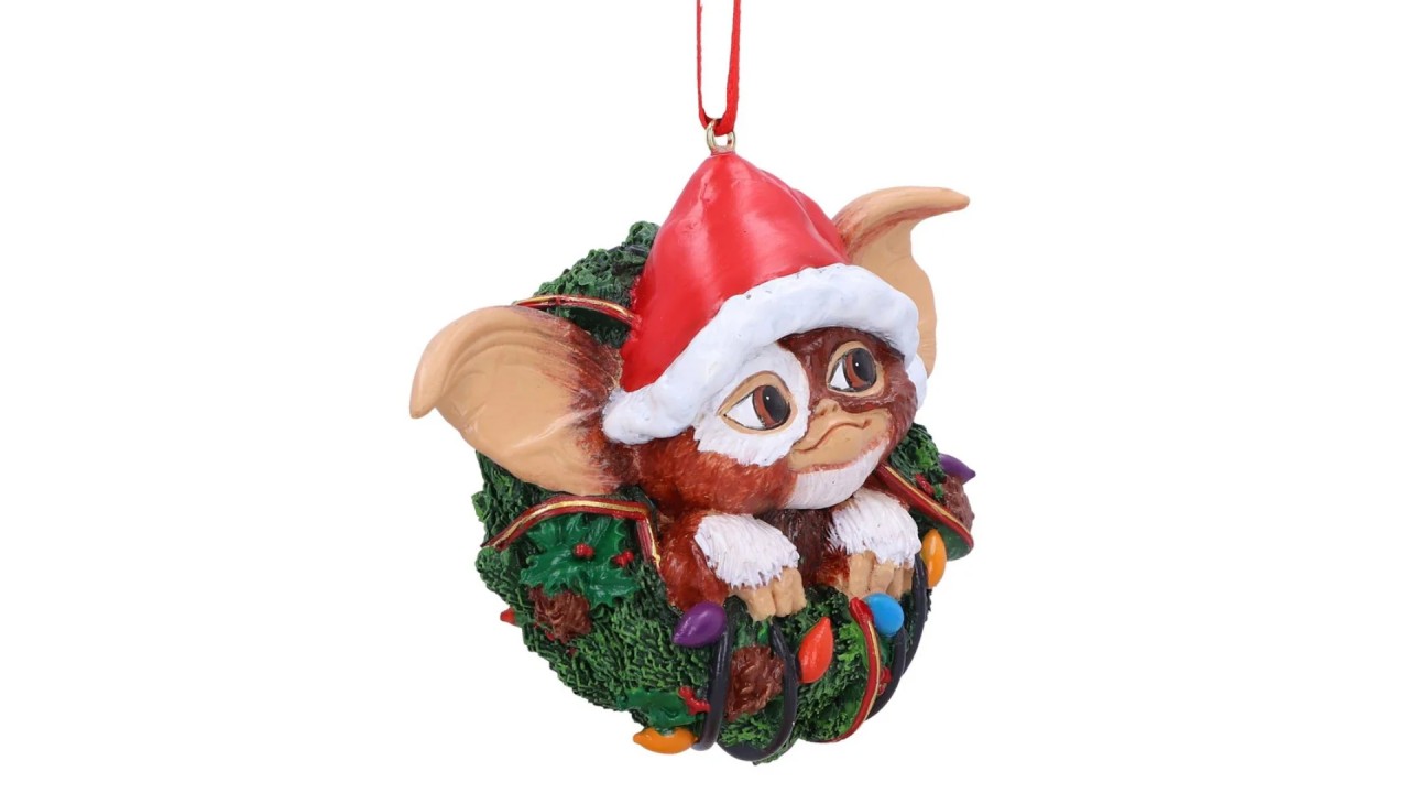 Aici putem admira un adorabil Gizmo iesind dintr-o coroană de Crăciun, decorată cu multă atenție și luminițe strălucitoare.