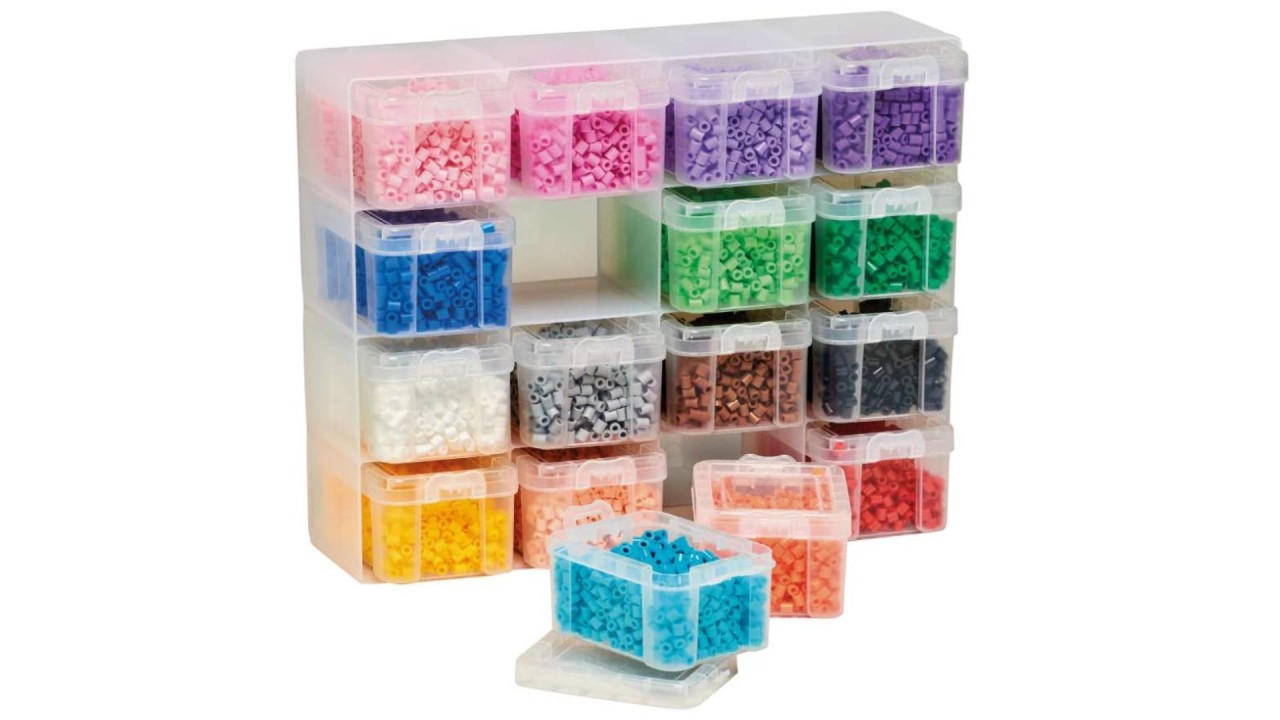 Cu 16000 de mărgele Hama midi, livrat cu un raft cu 16 locașuri pentru 16 sertare folosite pentru depozitarea mărgelelor.