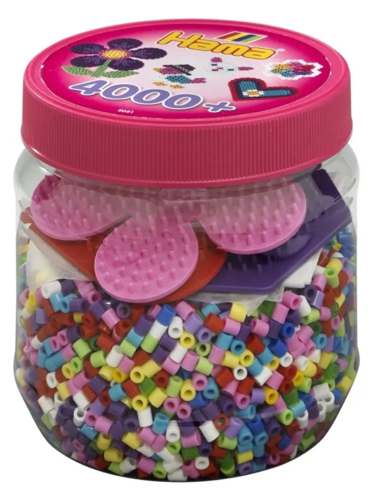 Acest set de mărgele de călcat Hama conține 4000 de mărgele de călcat în diferite culori, 1 placă de mărgele de călcat hexagonală, 1 placă de mărgele de călcat inimă, 1 placă de mărgele de călcat floare, hârtie de călcat și instrucțiuni.