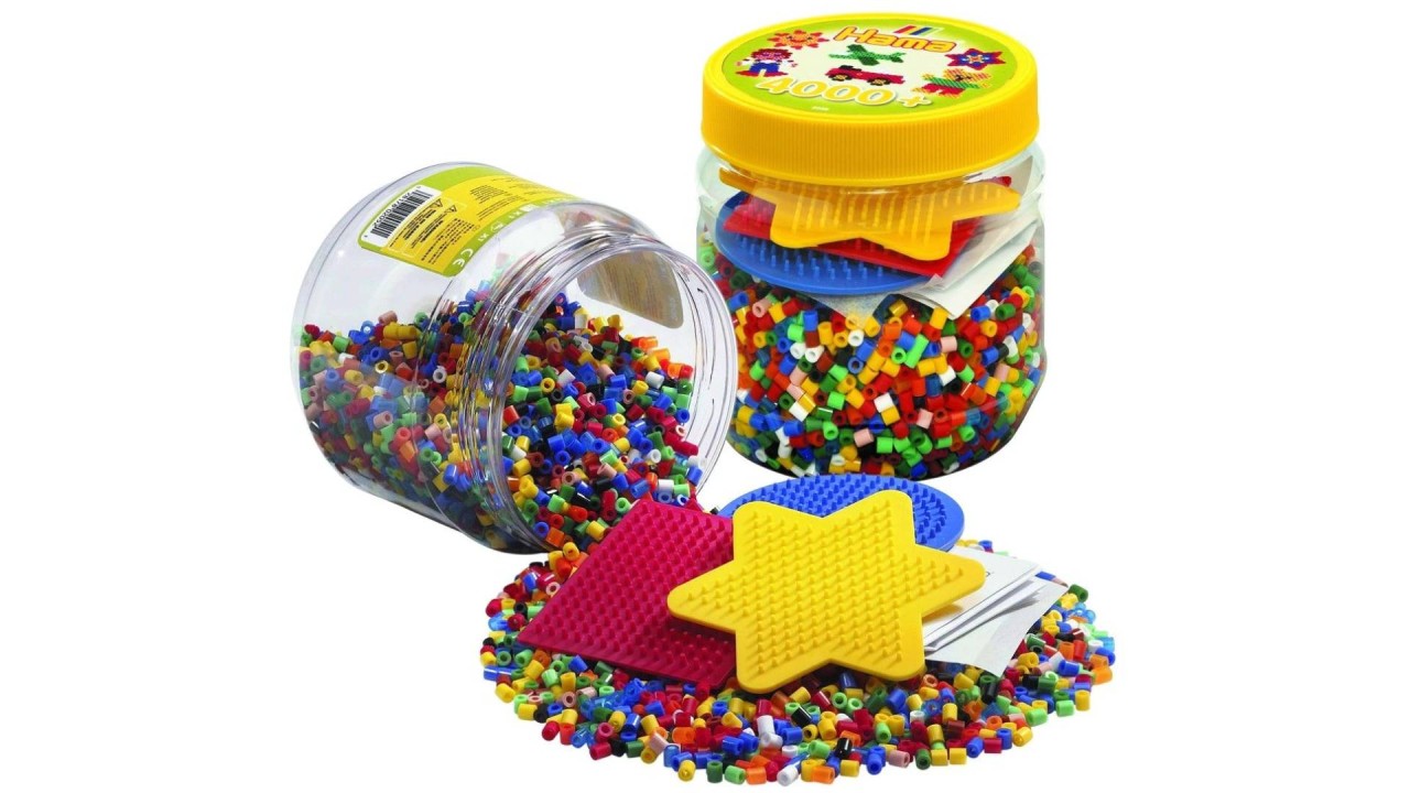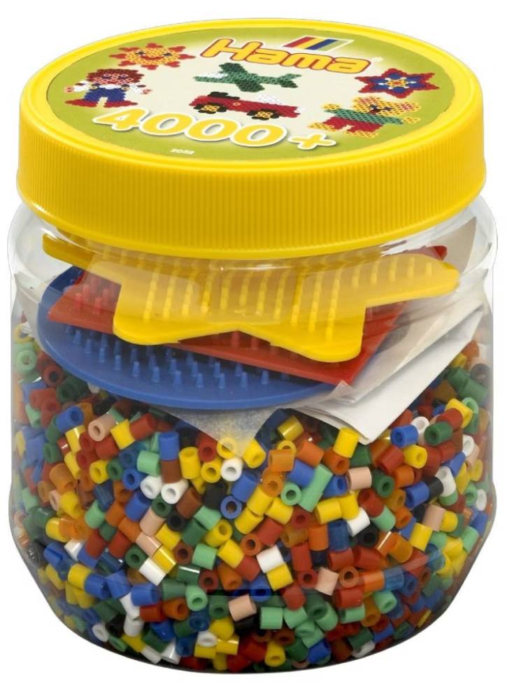 Hama beads come in a clear bucket with a yellow lid and contain: