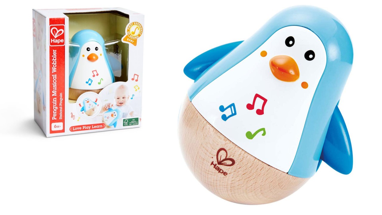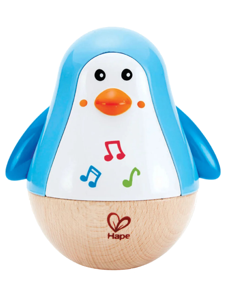 Acest pinguin amuzant este o jucărie roly-poly pe care un copil o poate lovi fără ca aceasta să se rostogolească.