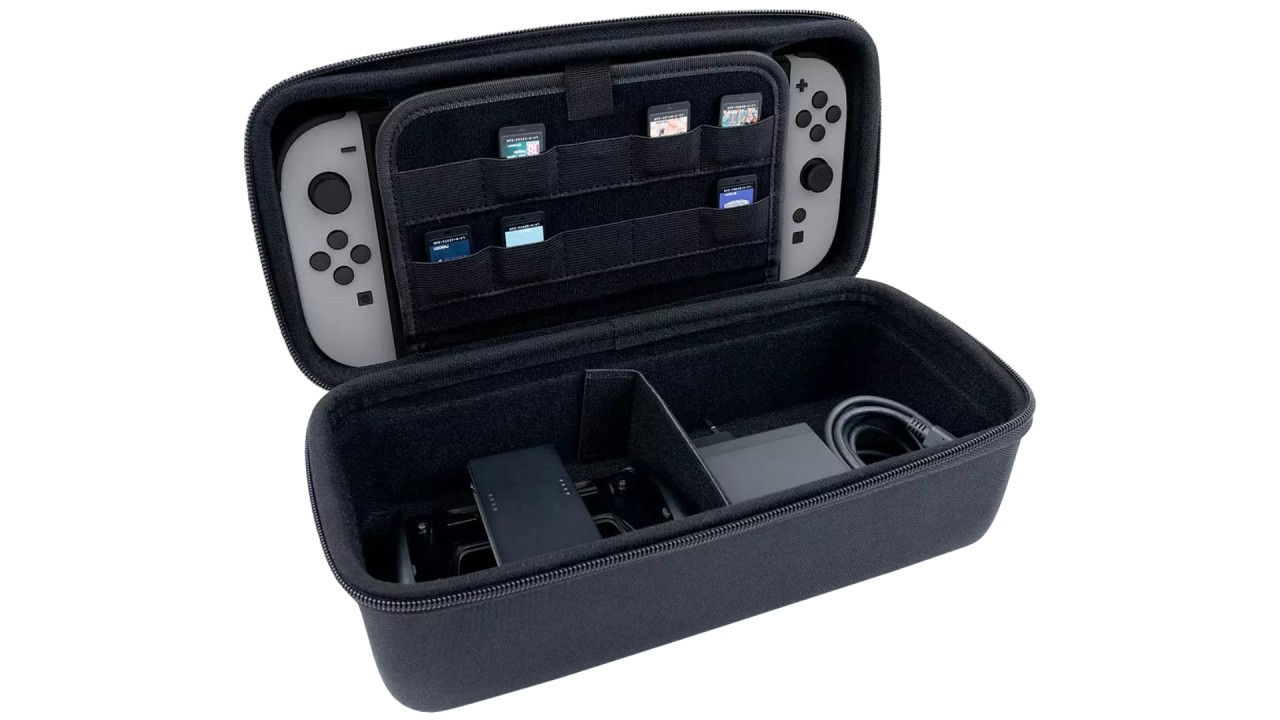 Dedicated compartments for console, Joy-Con controllers and other accessories. Slots for up to 10 game cards and 2 microSD cards.