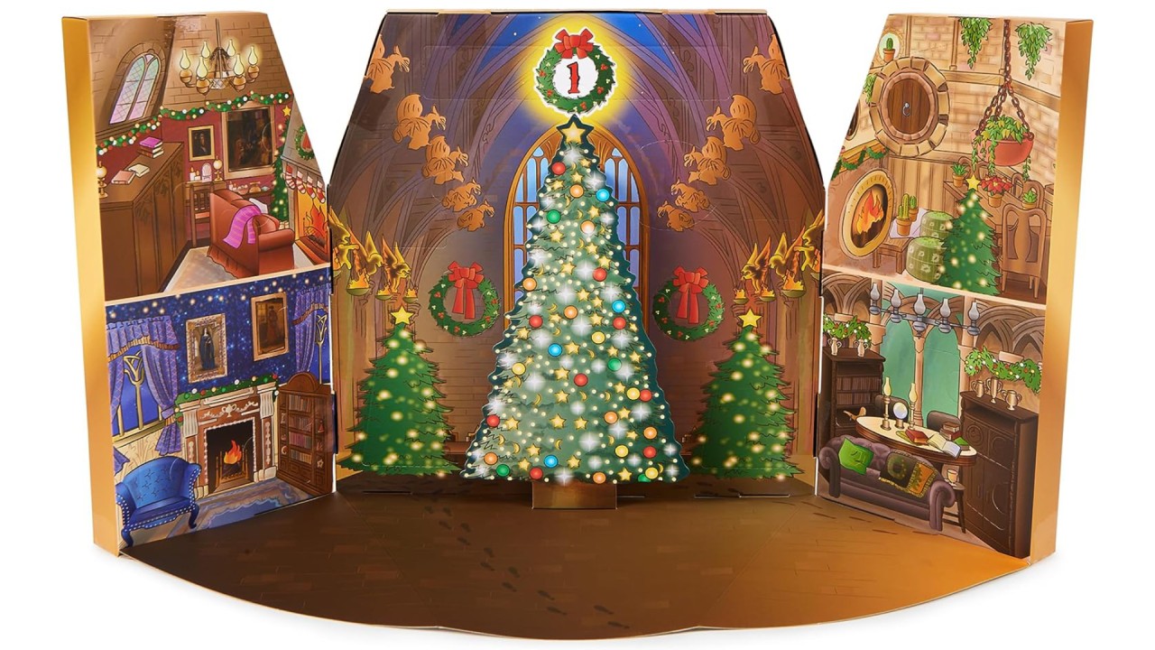 Deschide prima ușă pentru a găsi o baghetă Harry Potter cu lumină UV - luminează-o peste camerele comune din Hogwarts pentru a localiza numerele rămase pe calendar!