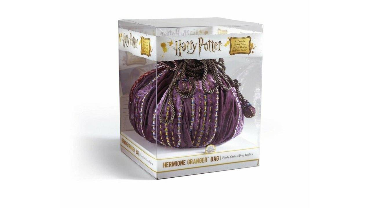 Această replică de recreere frumos detaliată a genții lui Hermione Granger are un cordon de închidere și detalii brodate.