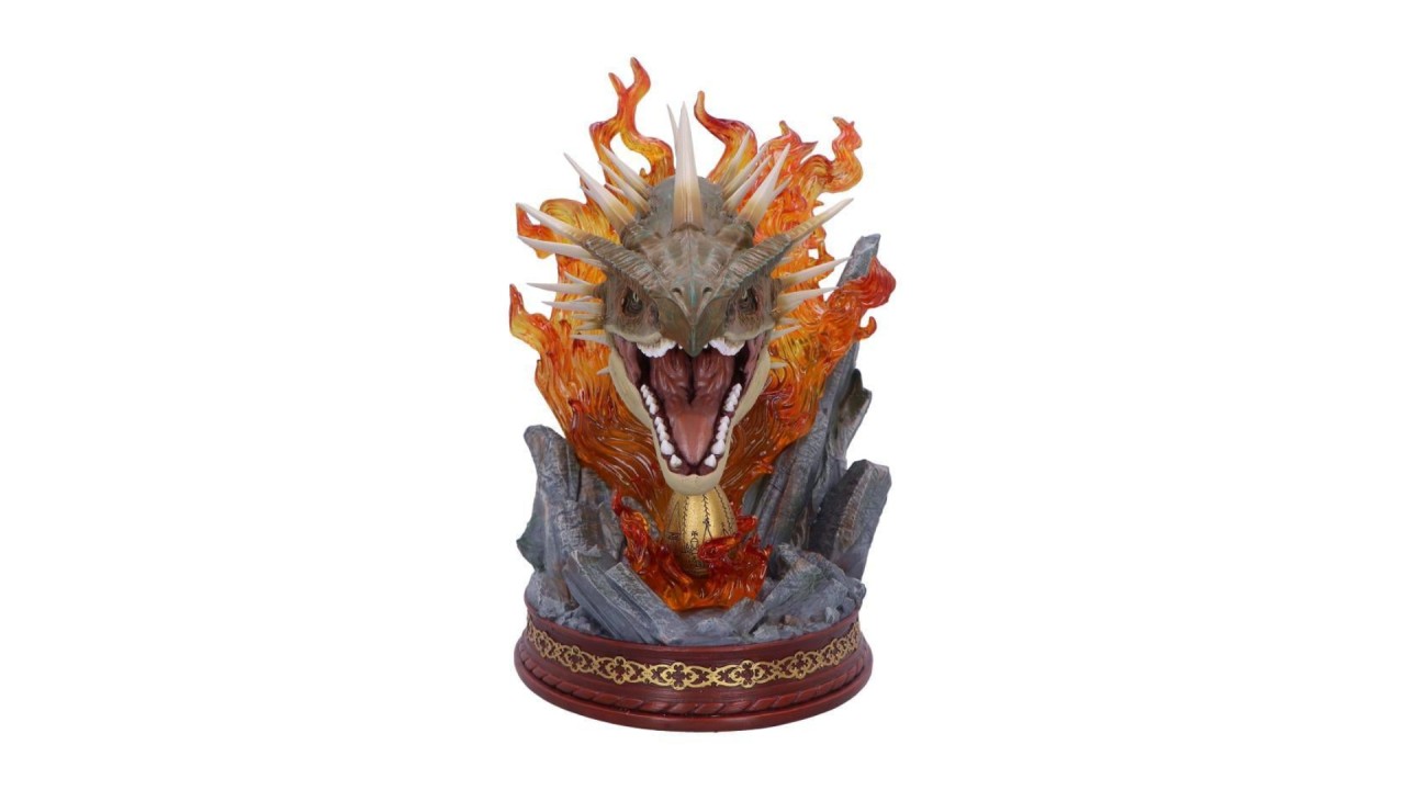 The bust presents an impressive sculpture of the head of the Hungarian dragon Horntail, surrounded by translucent orange flames that evoke the creature's ferocity.