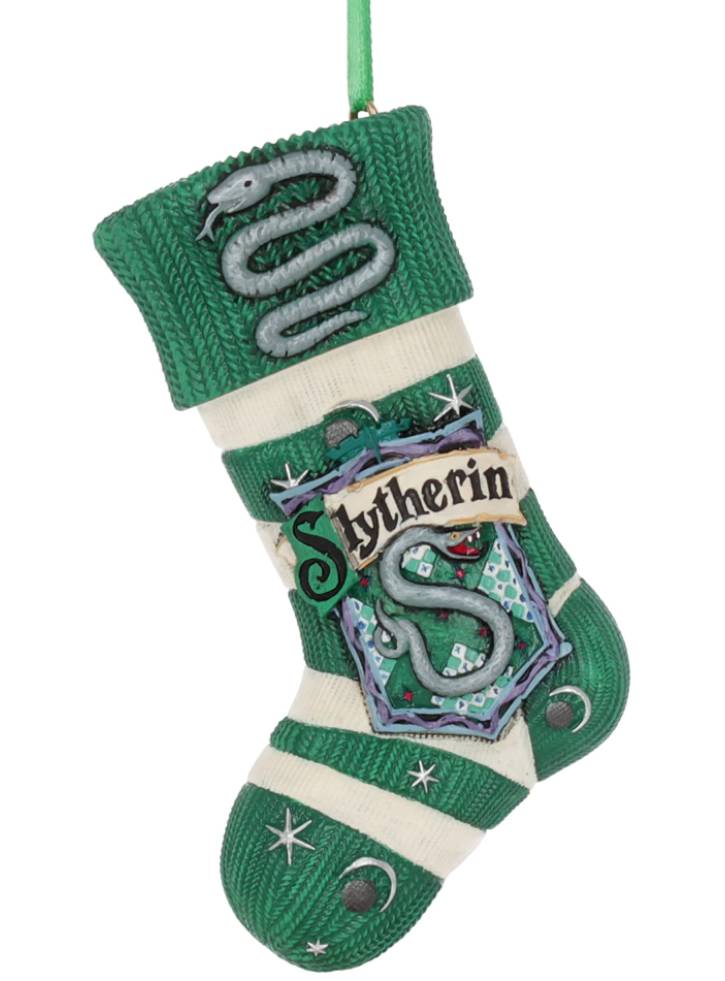 Here we have a Slytherin Stocking, immortalized in resin and ready to hang in your home. The emblematic animal of the house is a snake and its colors are green and silver.