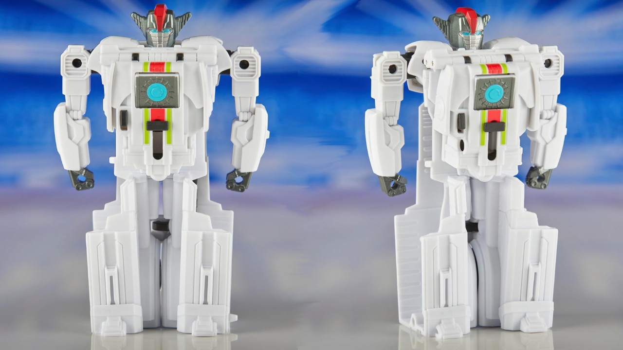 In his robot form, Wheeljack stands out with impressive technical details: white armor with green and red accents, reminiscent of his classic colors, as well as his distinctive face with blue visor and side antennae.