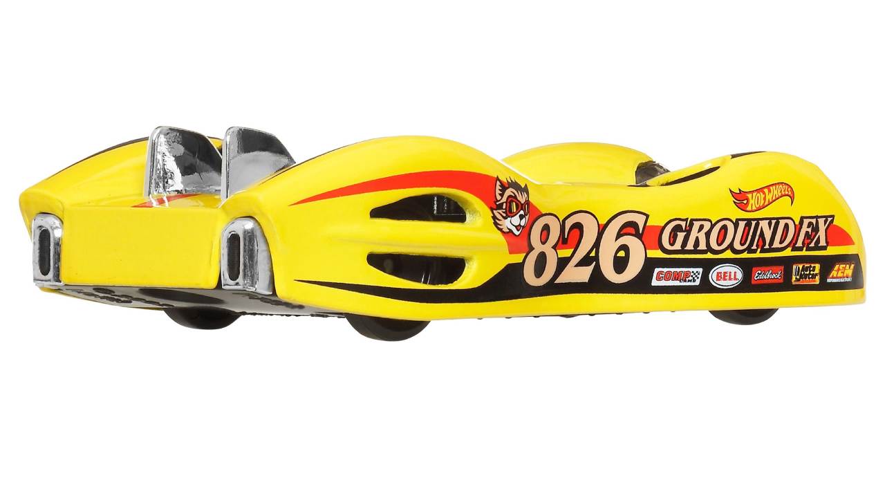 Modelul Hot Wheels Ground FX , deși de dimensiuni mici, reproduce perfect o adevărată mașină sport cu caroserie galbenă și grafică caracteristică.