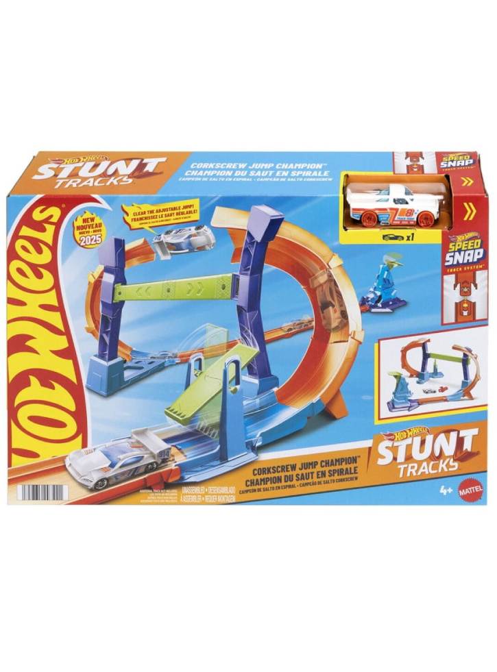 Porniți motoarele și pregătiți-vă pentru o cursă palpitantă cu Hot Wheels Stunt Tracks Corkscrew Jump Champion!