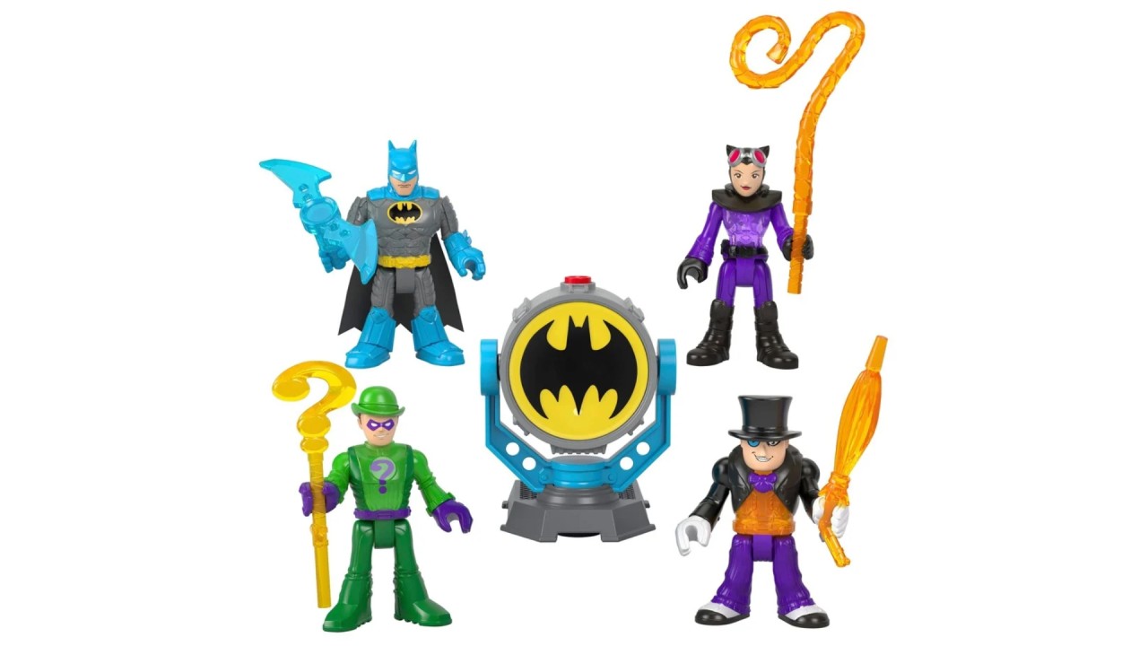 Tinerii luptători ai crimei pot intensifica acțiunea de luptă Super Erou versus Super-Vilain cu acest pachet multiplu Imaginext DC Super Friends Bat-Tech Bat-Signal.