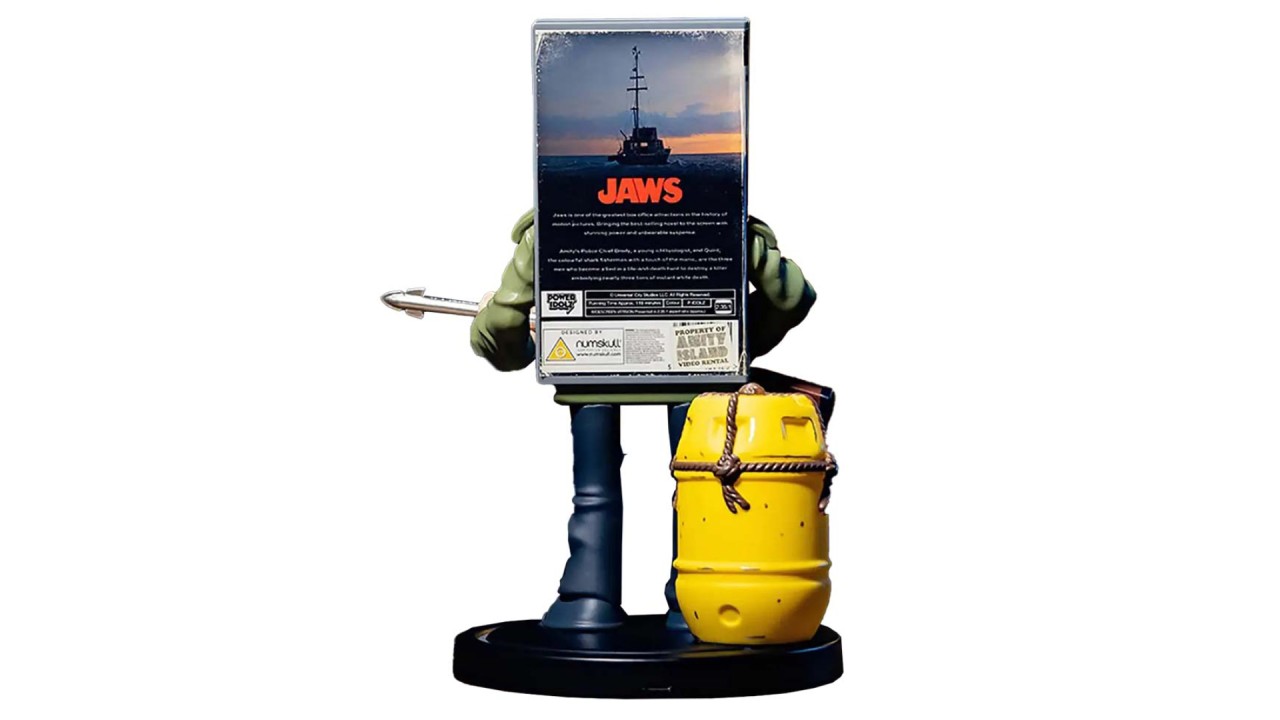 Wireless charging character representing the retro packaging of the classic Jaws VHS tape.