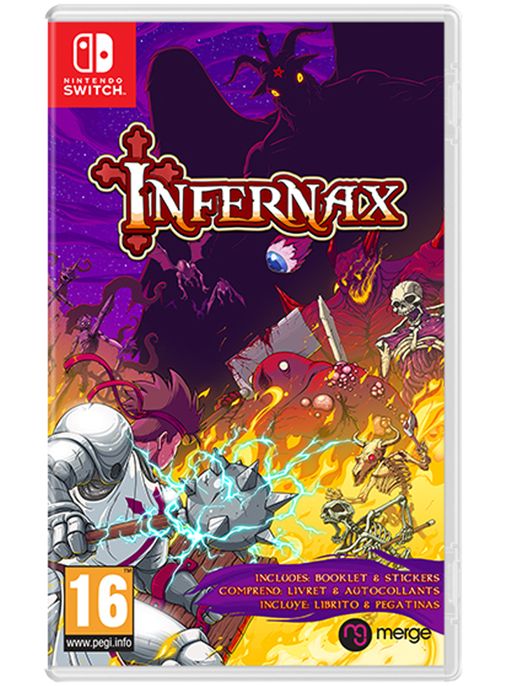 - O broșură și autocolante.Infernax reprezintă aventurile unui mare cavaler care se întoarce în țara sa natală doar pentru a o găsi afectată de magie profană.