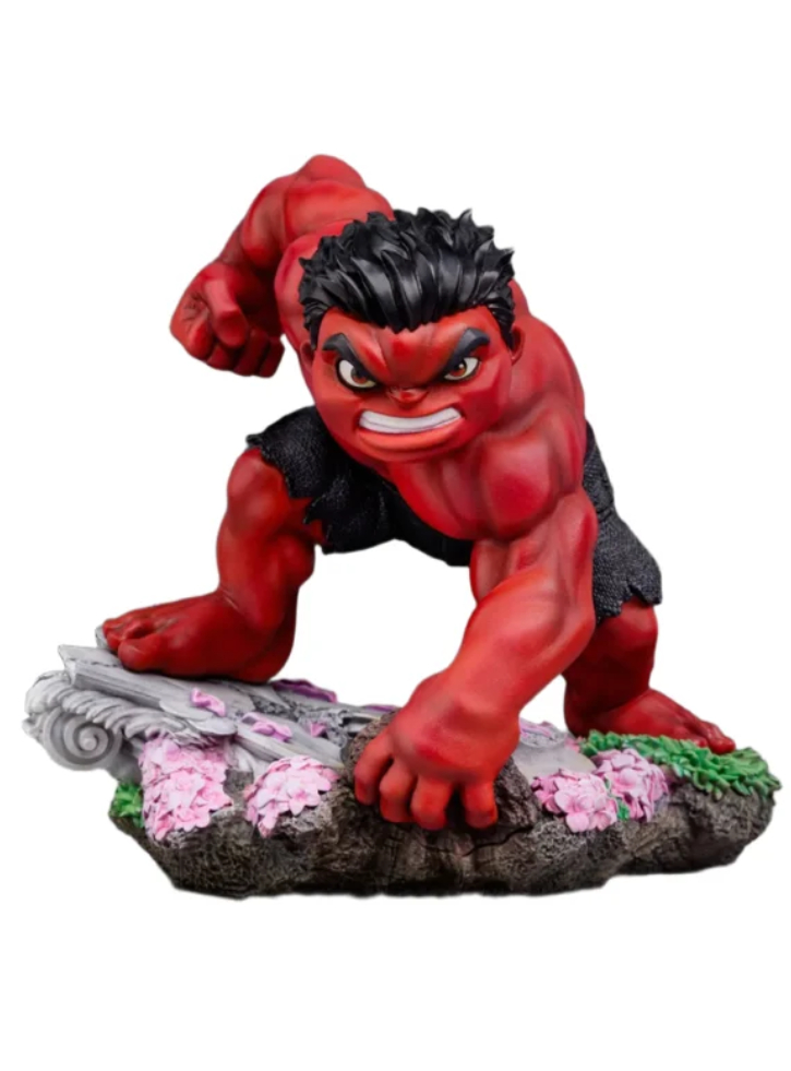 Explorarea statuii lui Hulk cel Roșu: Zdrobind o bază de beton în ruine și rămășițele unui pilon de marmură, deasupra florilor purpurii și a ierbii unei grădini, un gigant roșu puternic, musculos și furios, cu părul negru, este gata să sară în acțiune!