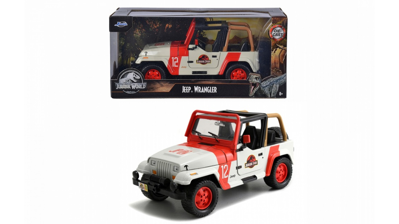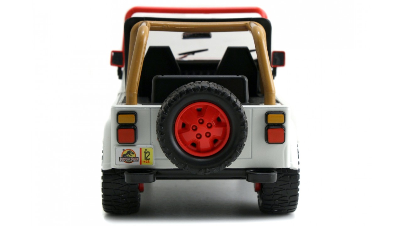 1:24 scale replica of the 1992 Jeep Wrangler Jurassic Park vehicle with premium paint and decorative details, working wheels, premium rubber tires, opening hood, doors and trunk.
