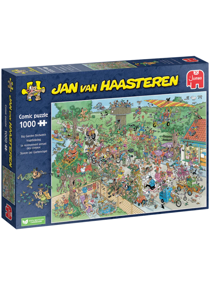 Scufundă-te în nebunia încântătoare a unei zile obișnuite în lumea capricioasă a lui Jan van Haasteren cu puzzle-ul „Big Garden Birdwatch”.