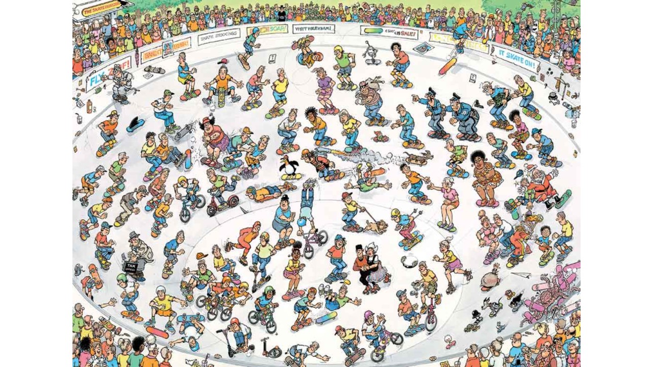 Each skater has his own style and tricks, and the background is full of comical situations that reflect the artist's unmistakable style.