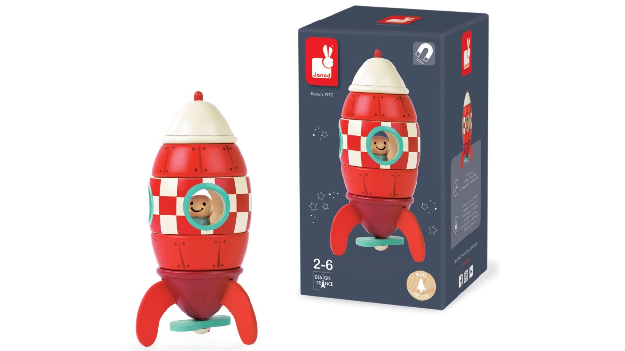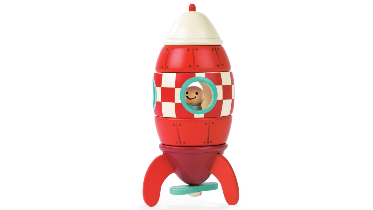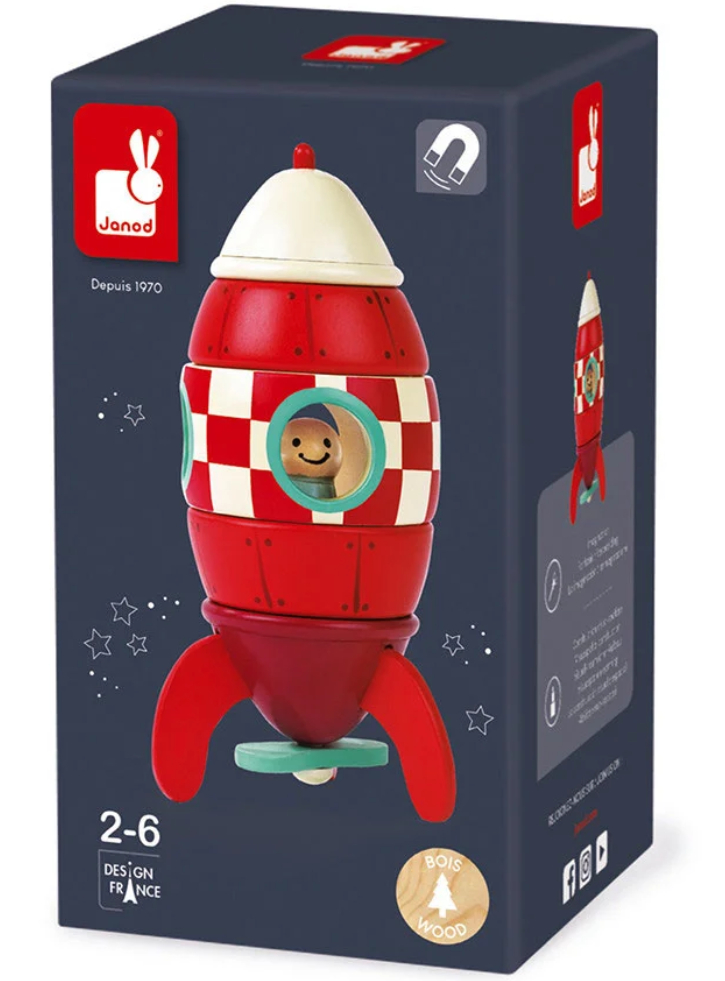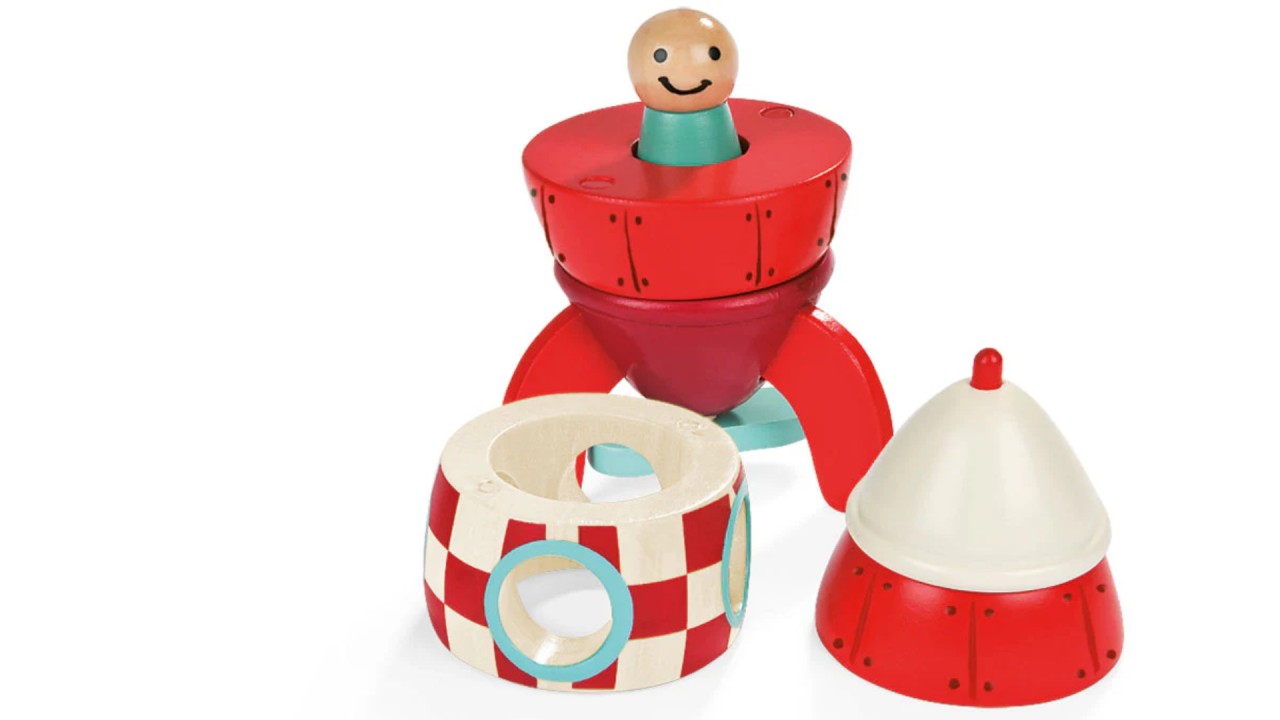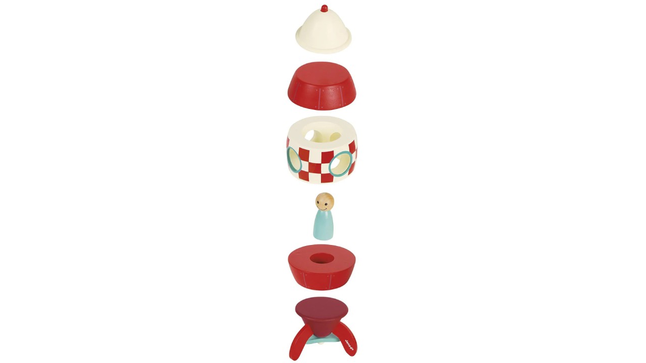 Această frumoasă rachetă de jucărie franțuzească din lemn de la Janod Toys este alcătuită din cinci straturi stivuite.