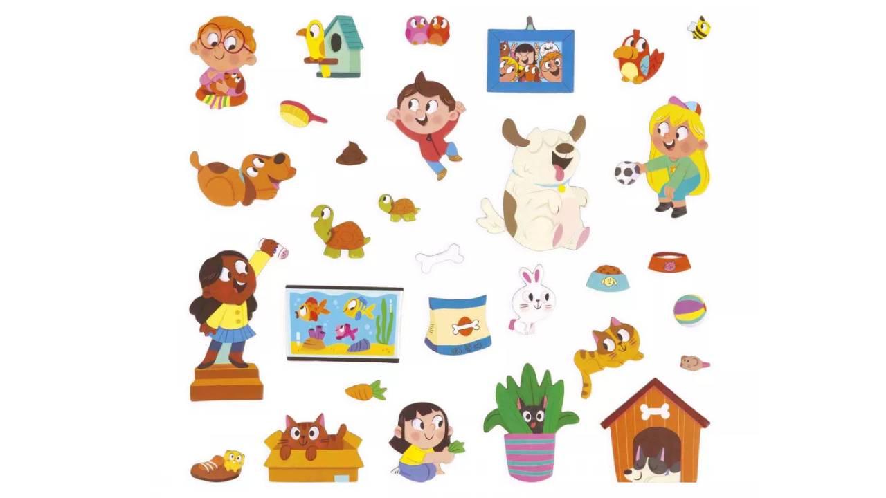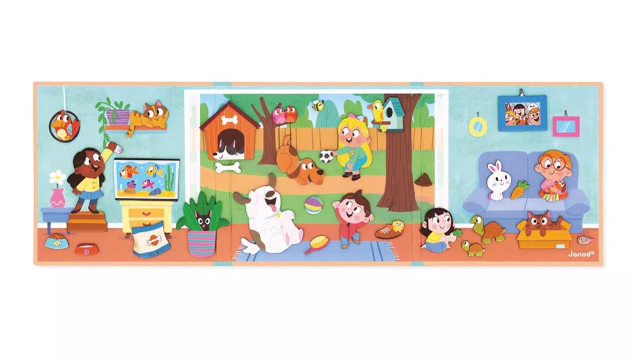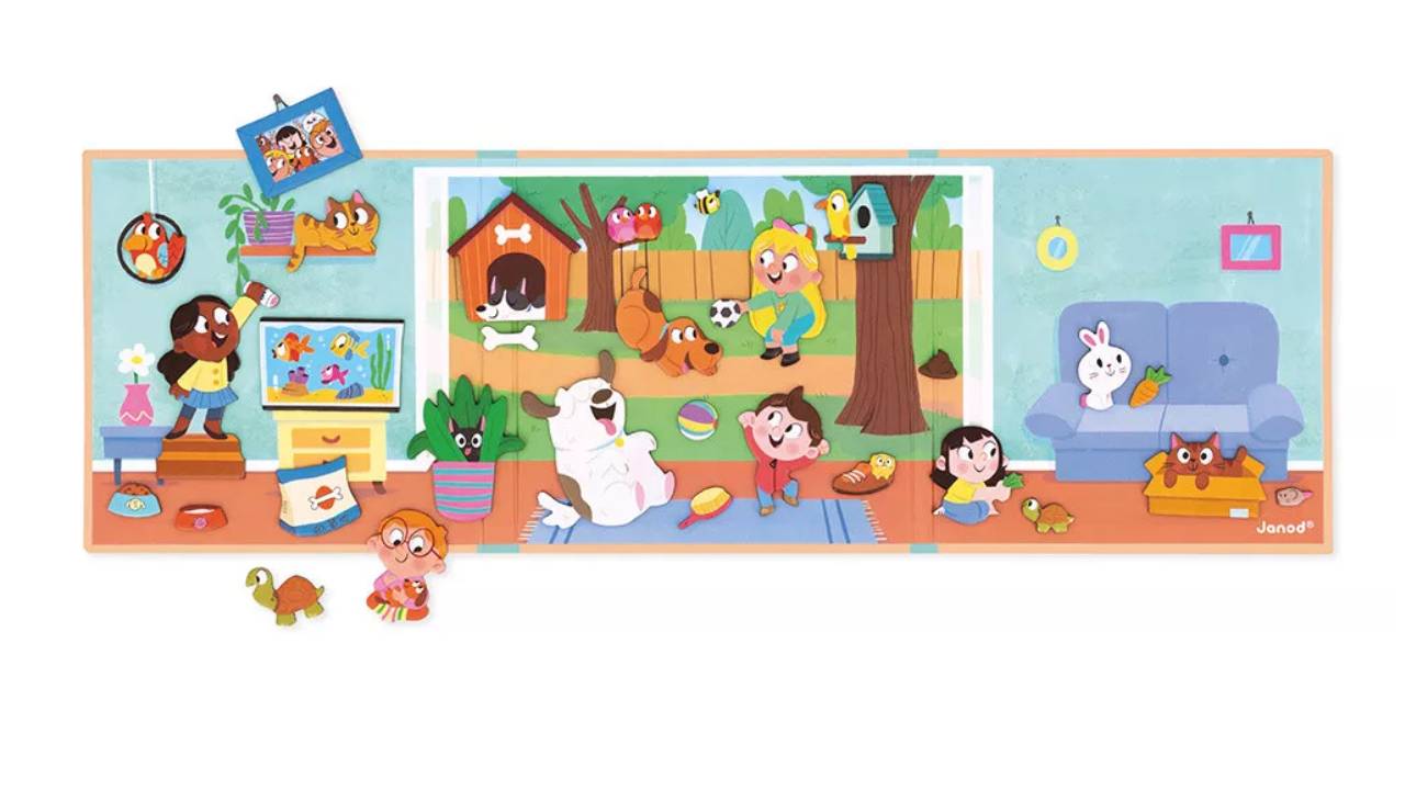 Cu diferiți magneți, copiii își antrenează dexteritatea mâinilor, imaginația și vocabularul în timp ce se joacă, hrănesc, îmbrățișează și îngrijesc câinele, pisica, broasca țestoasă, iepurele, peștele și alți companioni.