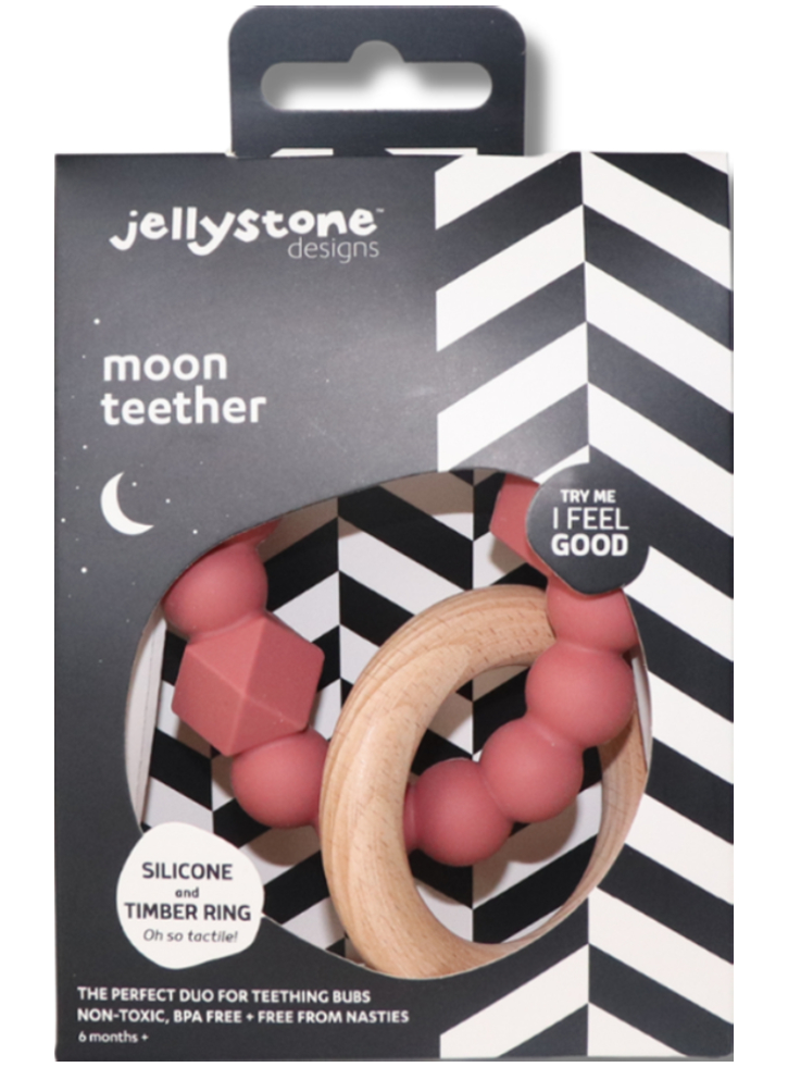 Jellystone Designs Moon Teether Dusty Pink este o jucărie pentru dentiție, concepută sub forma unei semilune.