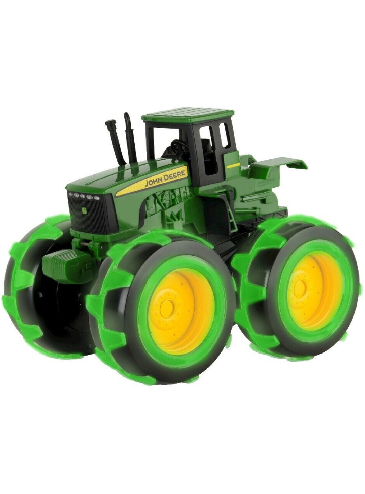 Tractorul John Deere Monster Light Up cu anvelope de 20 cm este un vehicul masiv. Luminile LED verzi se activează atunci când vehiculul rulează