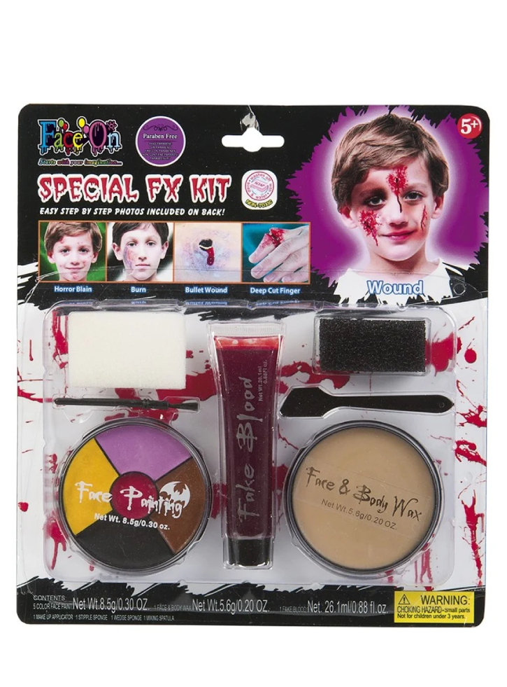 Conceput pentru Halloween, cosplay, petreceri tematice sau alte ocazii speciale, acest kit include o gamă variată de produse cosmetice și accesorii pentru efecte speciale care permit crearea unui machiaj de impact, cu detalii realiste.