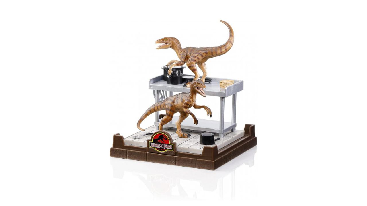 Această dioramă spectaculoasă recreează faimoasa scenă din bucătărie în care doi Velociraptori i-au hărțuit pe Lex și Tim.