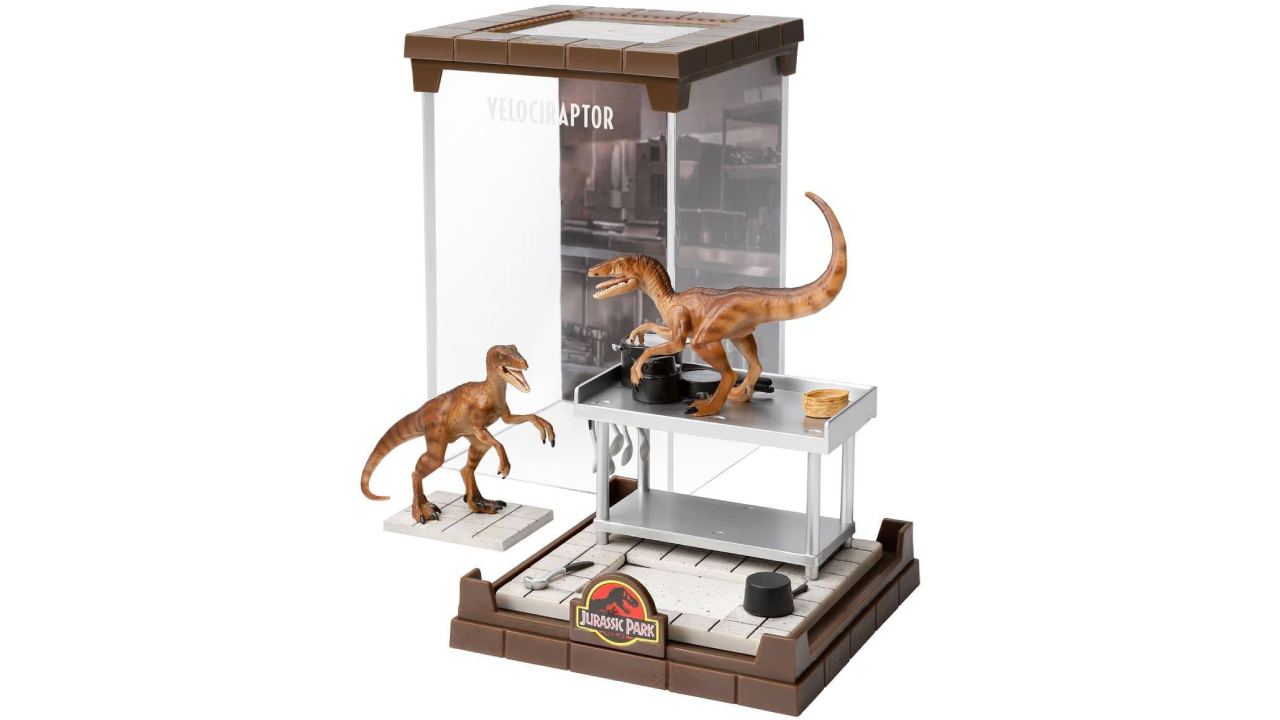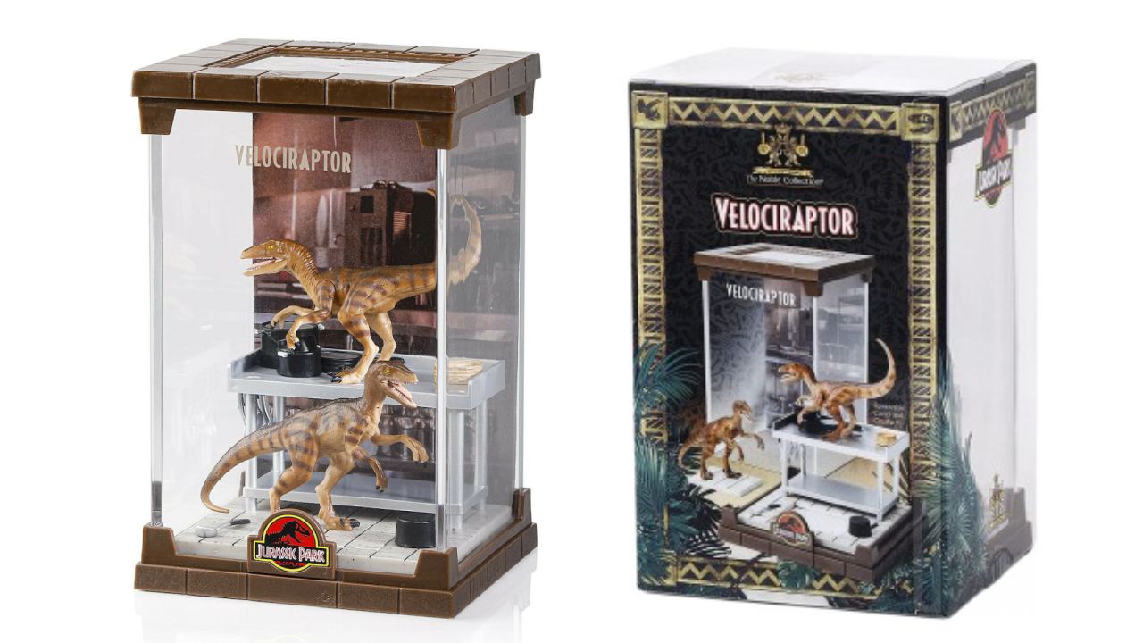 Înfricoșătorul Velociraptor, unul dintre cei mai emblematici dinozauri din „Jurassic Park” al lui Steven Spielberg, este o atracție vedetă printre toate replicile și figurinele bazate pe celebrul film.
