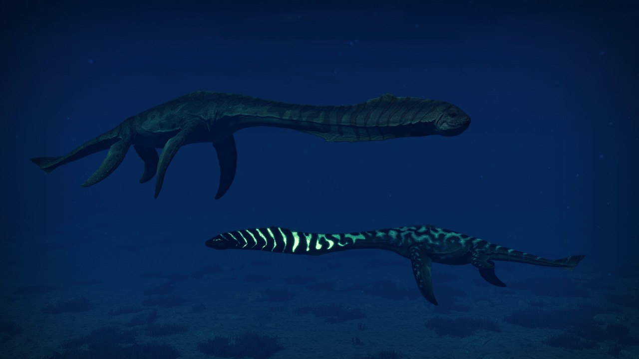 Styxosaurus, a marine species that ruled the Late Cretaceous waves. Its streamlined shape combined with sizable fins produces deadly undersea swiftness, making Styxosaurus one of the most efficient predators of its time. Try modifying its genome with diverse bioluminescent pattern colours.
