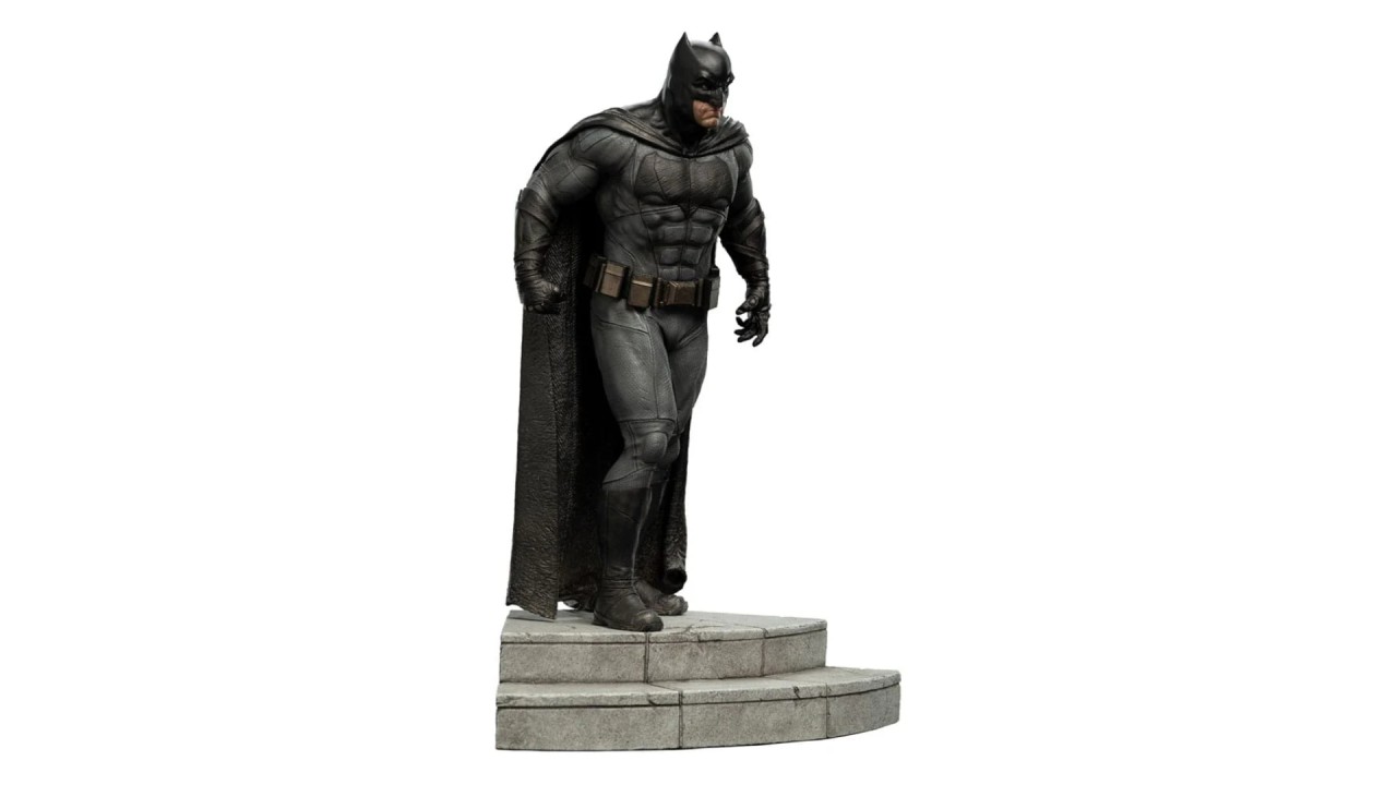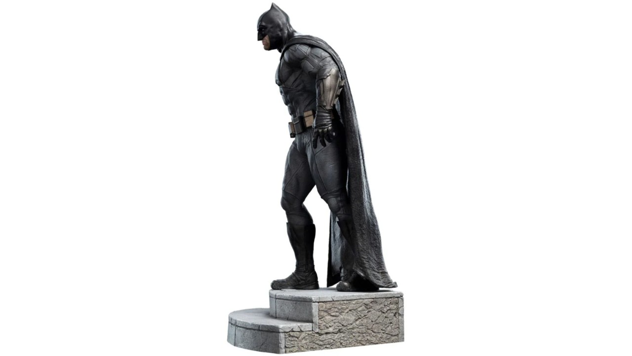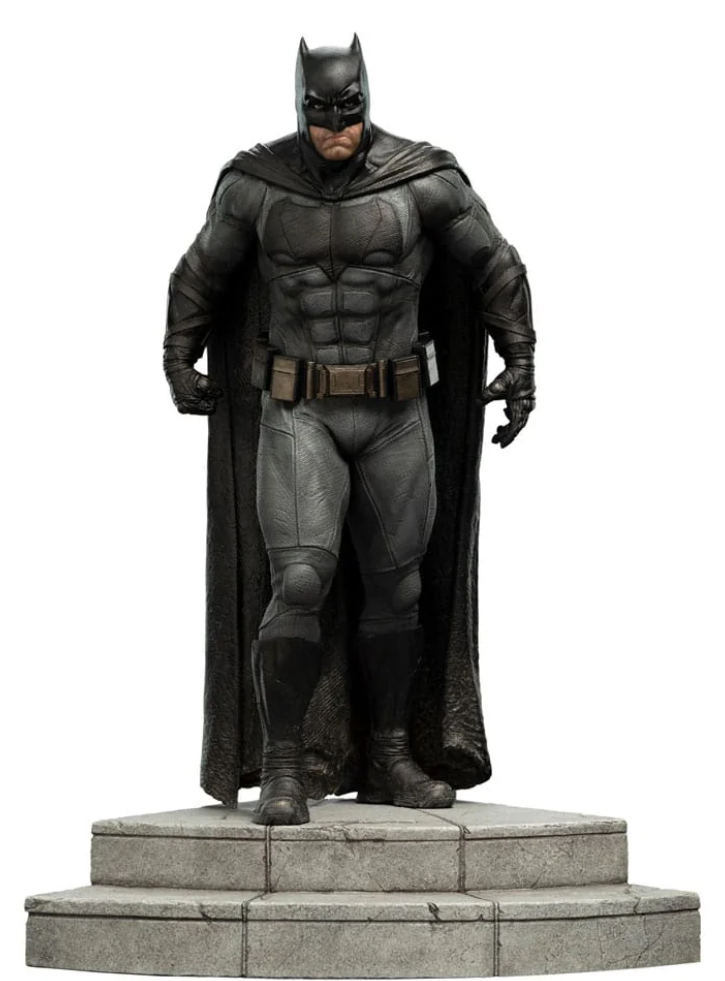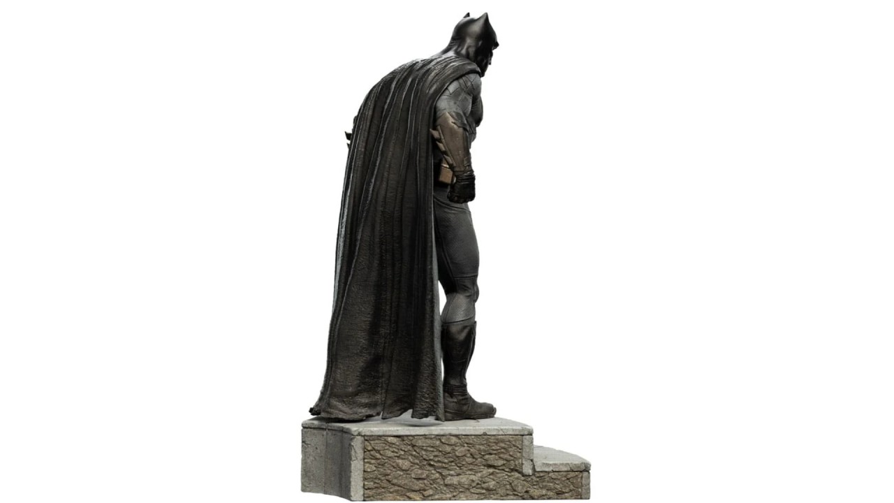 Statuia prezintă Batman într-o poziție eroică, cu costumele și echipamentele specifice din filmul Justice League, inclusiv cureaua cu gadgeturi, armura detașabilă și faimosul simbol al liliacului.