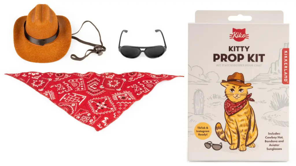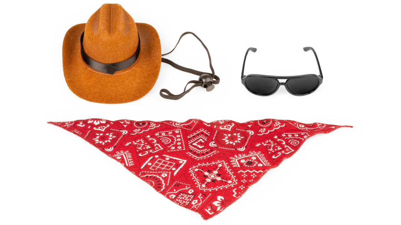 Kitul include o pălărie de cowboy, o bandană și o pereche de ochelari de aviator, toate concepute pentru a crea un look inspirat din Vestul Sălbatic.