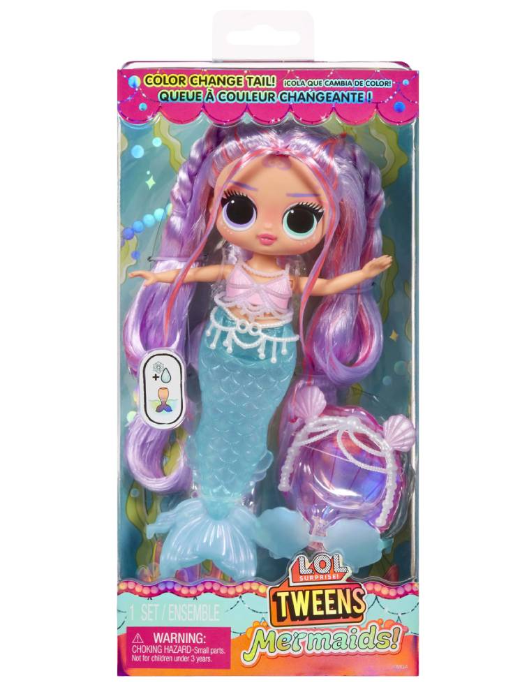 Pregătește-te să plonjezi într-o lume fermecătoare a distracției magice a sirenelor cu noua păpușă de modă LOL Surprise Tweens Mermaid Lola Marine, cu accesorii minunate!