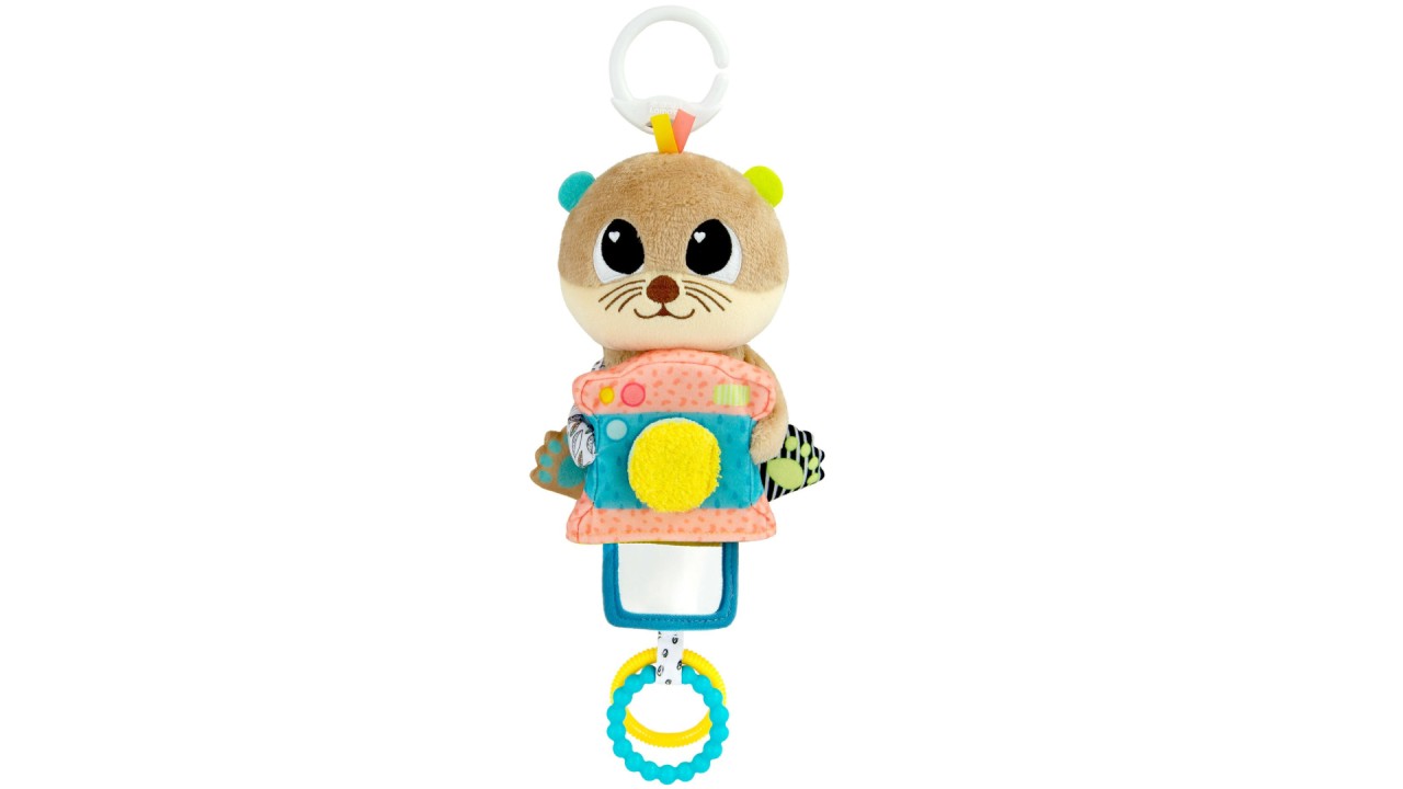 Show baby how this plush photographer ticks when squeezed, or let him grab on to the colorful rings that dangle below.
