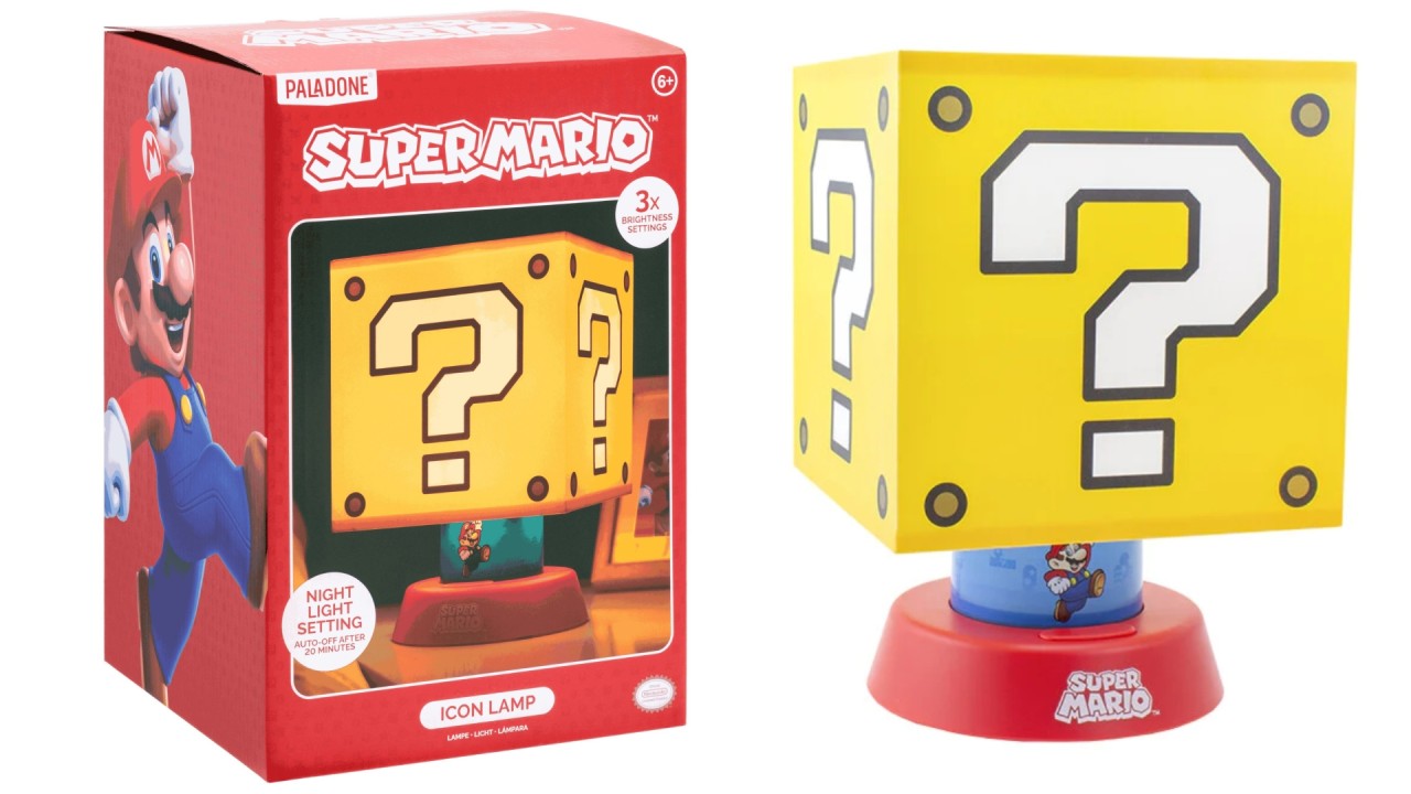 The question block shaped lamp sits atop a round red base, complete with a beautiful blue band decorated with images from the world of Super Mario.
