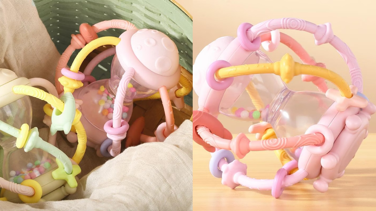 The bell has a captivating hourglass design, measuring 11.5 x 12.3 cm, which will surely attract the attention of your child.