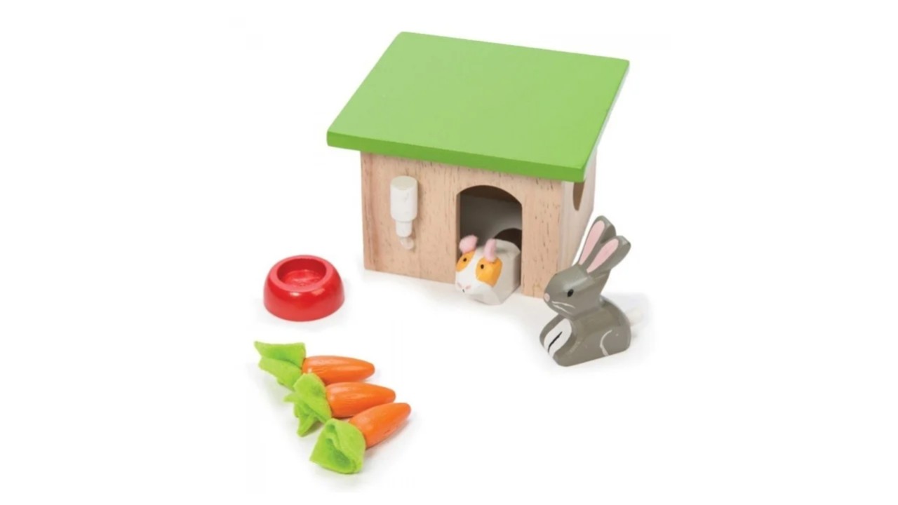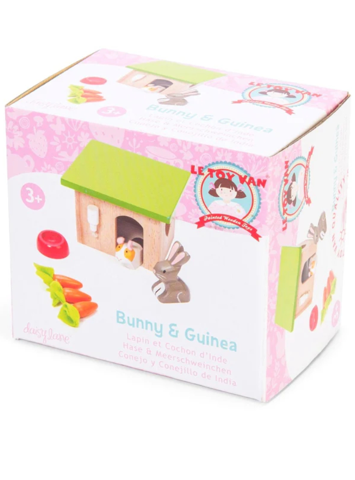 Acest set de joacă Iepuraș și porcușor de Guineea de la Le Toy Van prezintă un porcușor de Guineea și un iepuraș adăpostiți într-o cușcă cu acoperiș verde, cu 3 morcovi și un bol cu apă.