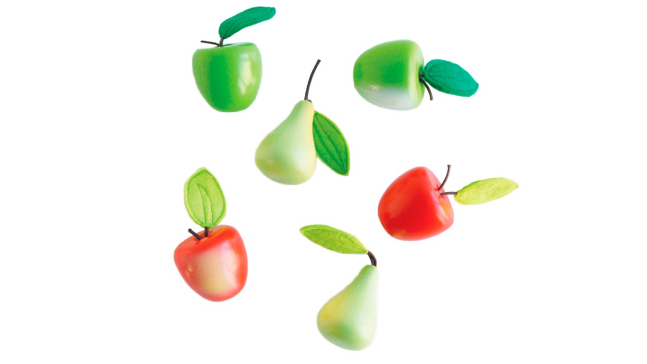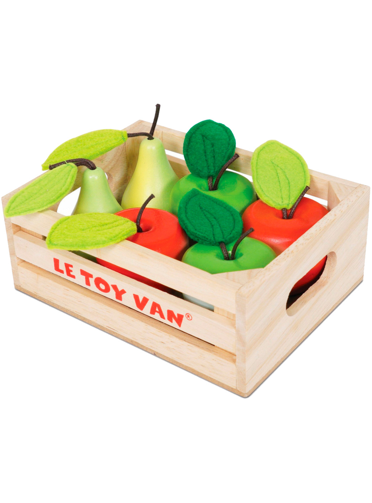 Setul conține o ladă frumoasă și detaliată, confecționată din lemn de înaltă calitate, în care sunt incluse șase fructe colorate viu: trei mere și trei pere.