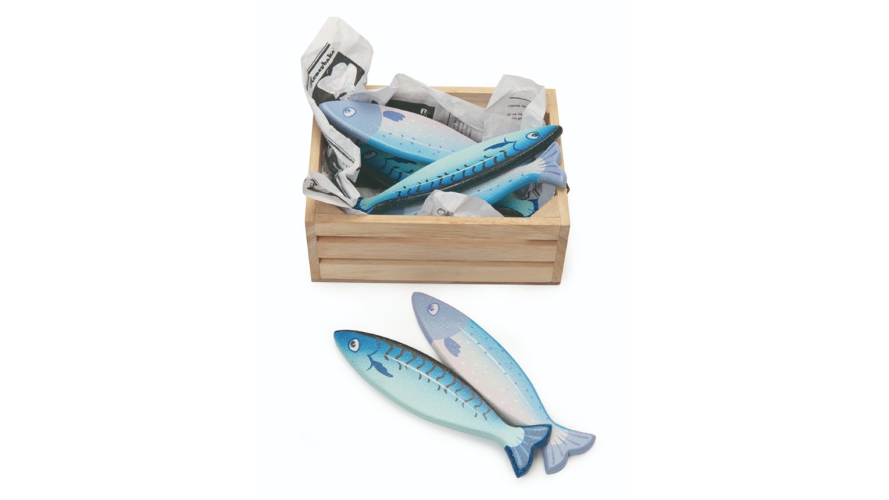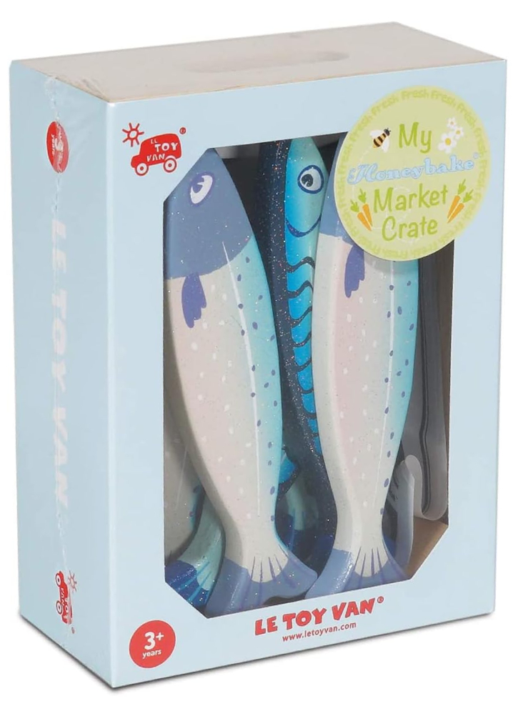 Jucăria este special concepută pentru a stimula dezvoltarea fiecărui copil și recompensează jocul creativ. Pachetul include o ladă cu șase pești din lemn strălucitori în 2 modele diferite: cu dungi și cu pete.