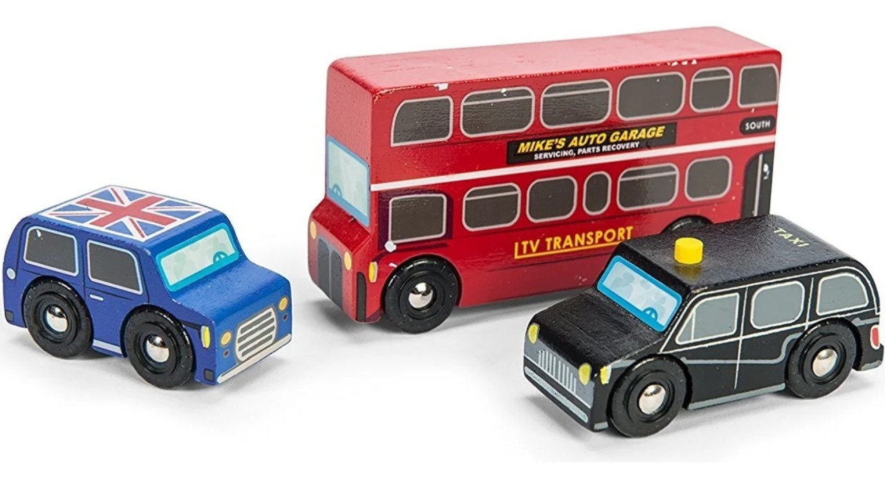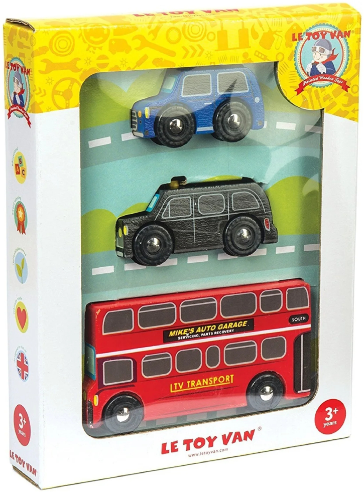 Un set unic de 3 vehicule britanice din lemn care iti vor captiva cu siguranta atentia. Vei primi in acest set un celebru autobuz londonez, un iconic taxi negru clasic si o minunata mini-masina. Aceste jucarii din lemn vopsit sunt fabricate de renumitul producator Le Toy Van, cunoscut pentru siguranta si calitatea produselor sale.