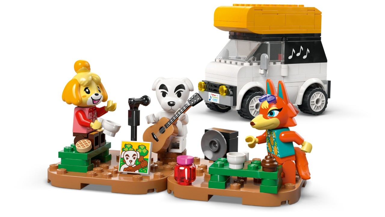 This brick-built playset includes K.K., Isabelle and Audie minifigures, a Resident Services model with a cafe and a drivable camper vehicle toy.