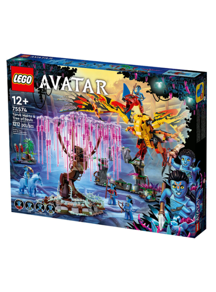 Set includes Na'vi Jake Sully, Neytiri, Mo'at and Tsu'Tey minifigures, an articulated Toruk figure with sheet metal wings, Direhorse figure and a buildable Tree of Life, plus 3 set constructions with glowing elements in the dark.