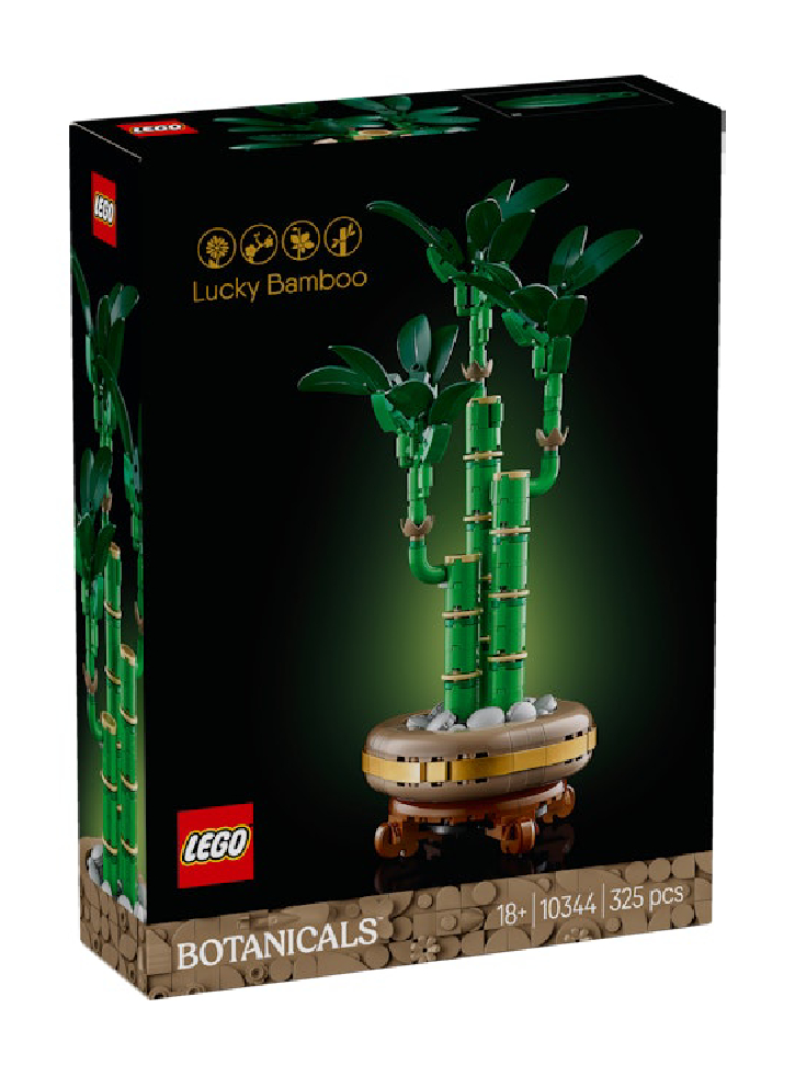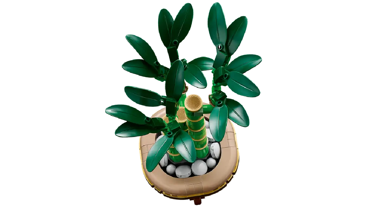 The LEGO bamboo plant includes a pot with a wooden base, pebbles and 3 green bamboo stems for a realistic appearance.