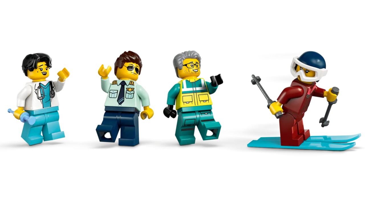 The set also includes a snow scooter and a small airport scene with a toy sock, plus first toy aid and minifigurine, doctor, paramedic and skier accessories.