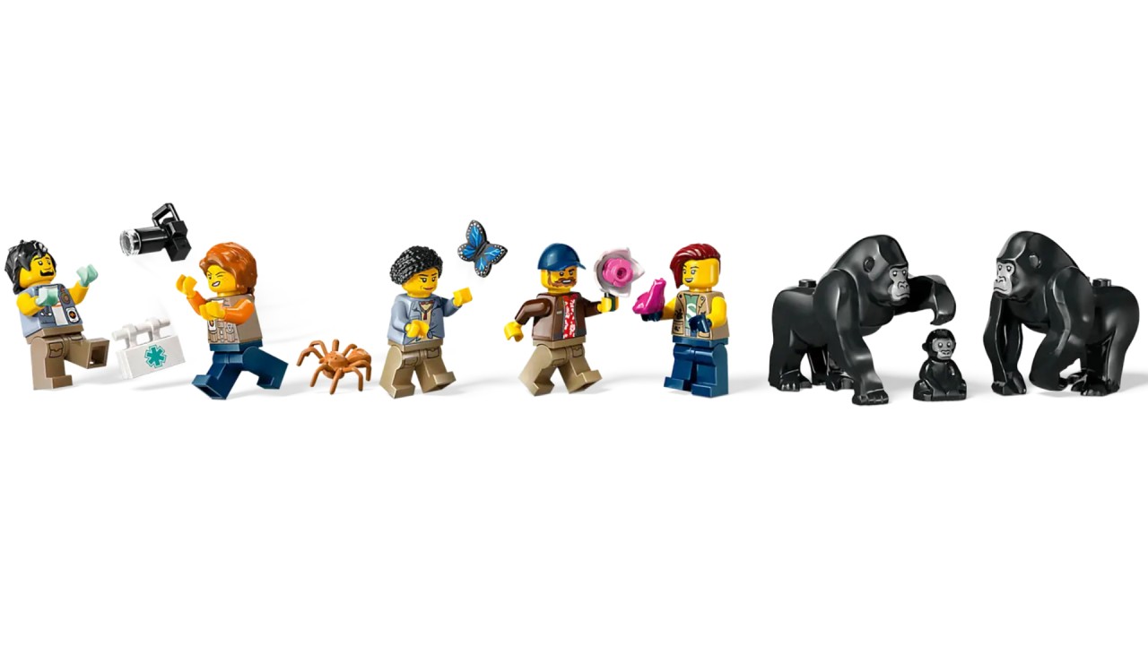 Setul include, de asemenea, o motocicletă, o barcă de mlaștină și o tabără de bază în junglă, plus 5 minifigurine de aventurier și 3 figurine de jucărie gorilă, inclusiv un pui de gorilă, pentru joacă imaginativă și povestiri.