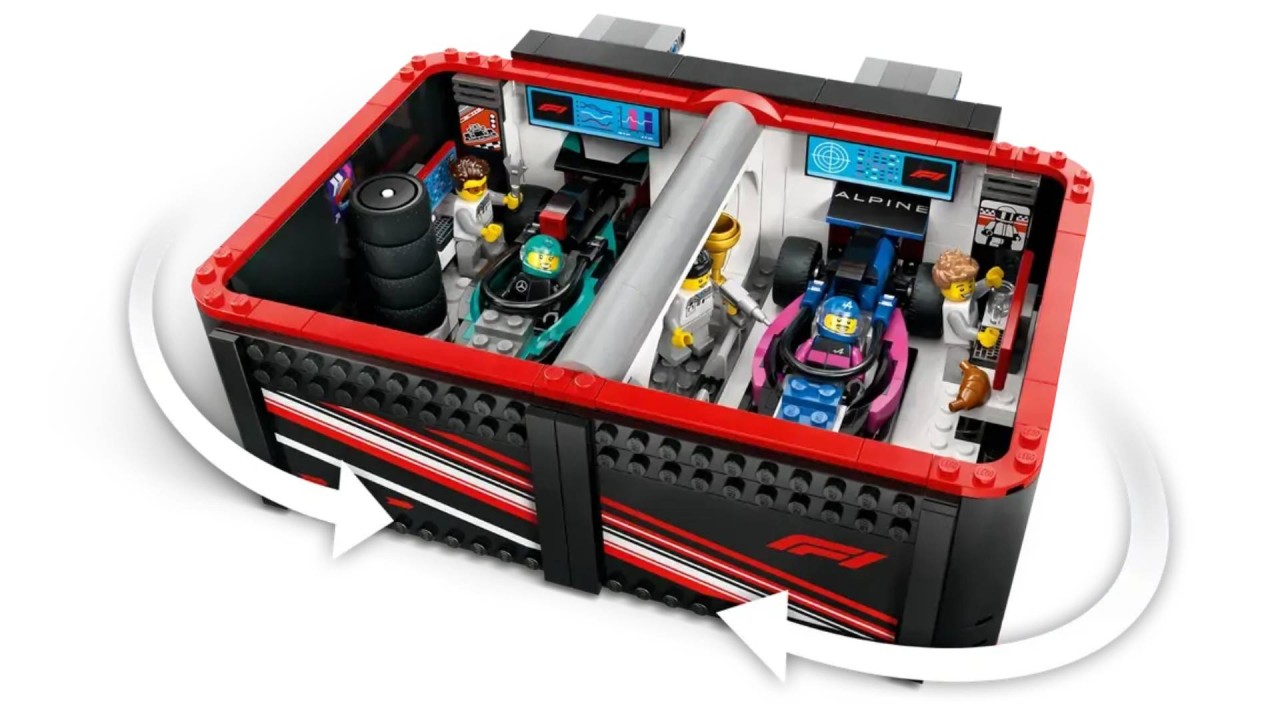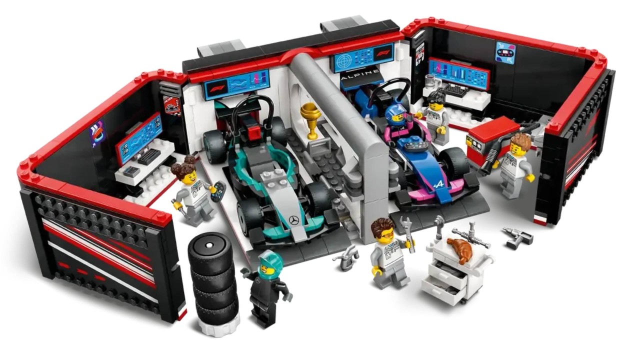 Children can walk into the thrilling world of Formula 1 with the LEGO City F1 vehicle toy Garage & Mercedes-AMG & Alpine Cars (60444).