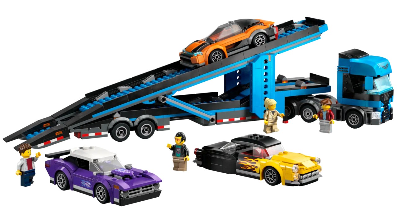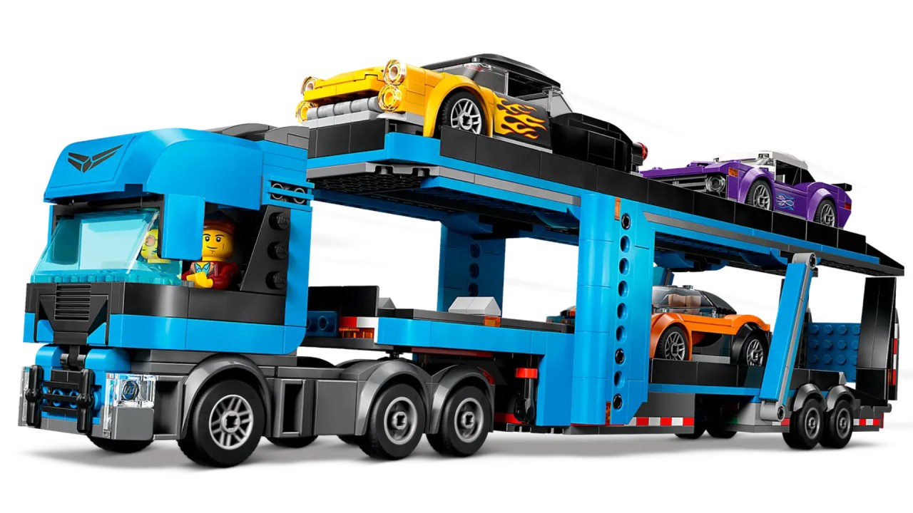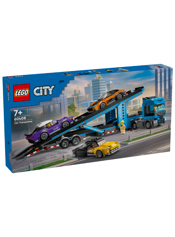 Răsfață un pasionat de mașinuțe cu acest set de construcție cu mai multe vehicule LEGO City Car Transporter Truck with Sports Cars (60408).