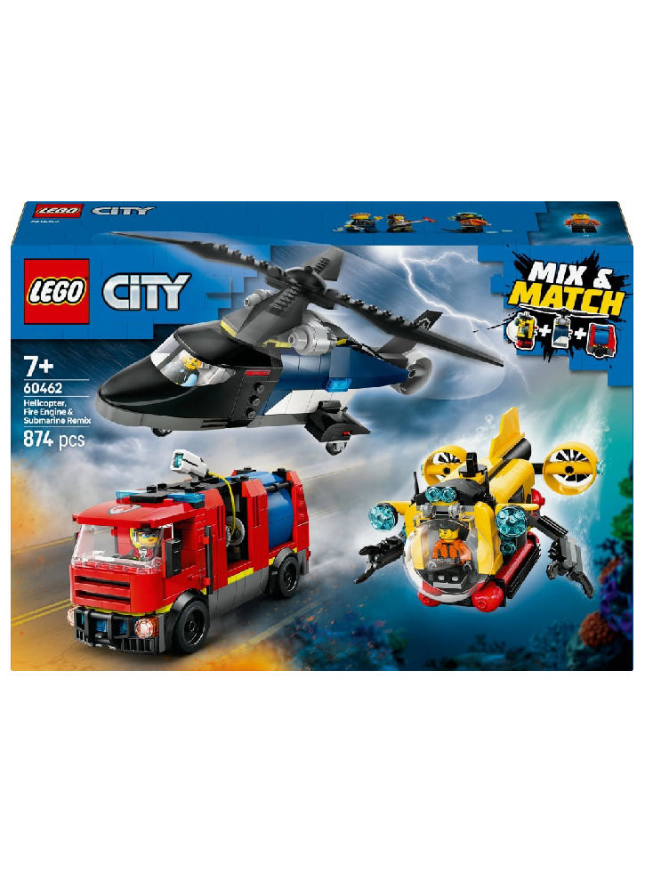 Acest set de joacă cu elicopter, mașină de pompieri și submarin include un ghid de construcție tipărit și instrucțiuni 3D în aplicația LEGO Builder.