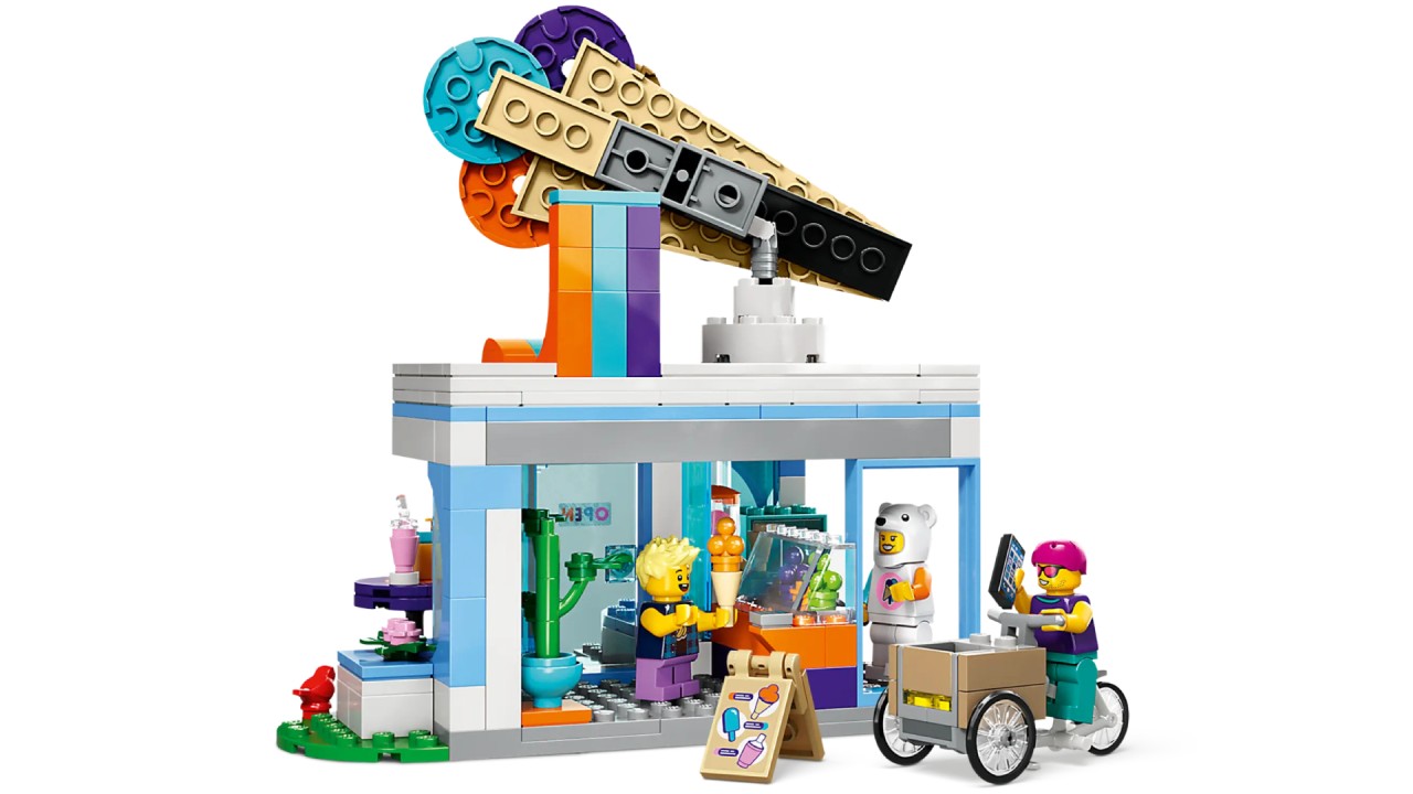 Există, de asemenea, o bicicletă cargo și 3 minifigurine, inclusiv un vânzător cu un costum amuzant de urs polar. Acest set este livrat cu un ghid de construcție ilustrat ușor de urmat și instrucțiuni pas cu pas în aplicația LEGO Builder.